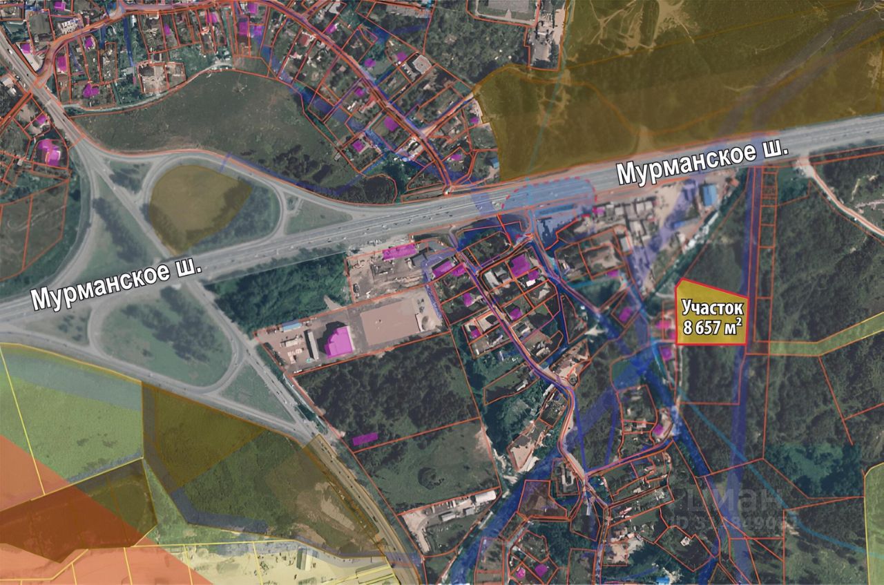 Площадь участка 8 657 кв.м. Съезд с Мурманского ш. Электрические сети - на границе участка. Категория - Земли населенных пунктов. Вид разрешённого использования - Для размещения объектов торговли. Территориальная зона - ТД1.