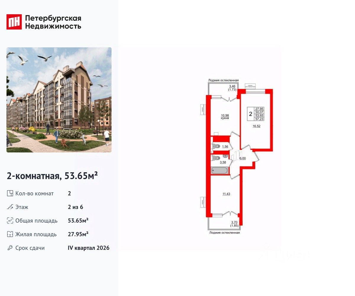 Удобная, классическая планировка, кухня 10.98 м², вместительная прихожая 6 м². Общая площадь квартиры - 53.65 м², жилая 27.95 м², высота потолка 3 м.