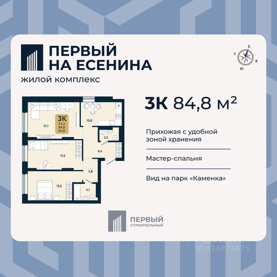 продам 3-к, Есенина, 12/3в стр.13 026 400 ₽