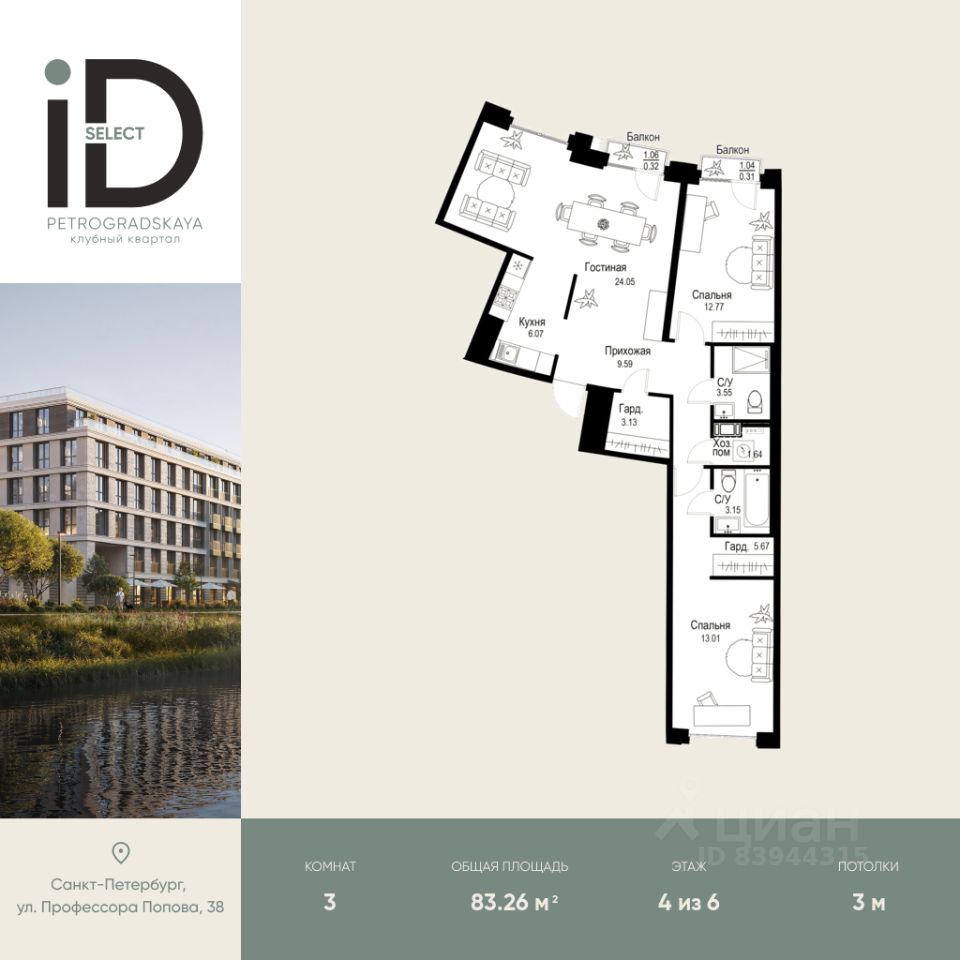 Клубный квартал iD Petrogradskaya на ул. Профессора Попова, 38 объединяет современную архитектуру, удобные планировки и развитую инфраструктуру, предлагая комфортную жизнь в престижном районе Санкт-Петербурга. Из квартир открываются виды на Иоанновский монастырь и реку Карповку. В шаговой доступности три станции метро: ''Петроградская'', ''Чкаловская'' и ''Чёрная речка''. 3-метровые потолки и эксклюзивные планировки создают атмосферу простора и уюта. Внутреннее пространство квартала включает благоустроенные дворы, курдонёры и подземный паркинг. Квартиры площадью от 20 до 136 м² с кухнями-гостиными до 40 м² и террасами с панорамными видами сдаются без отделки, оставляя свободу для индивидуальных интерьерных решений.