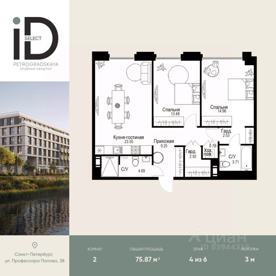 Клубный квартал iD Petrogradskaya на ул. Профессора Попова, 38 объединяет современную архитектуру, удобные планировки и развитую инфраструктуру, предлагая комфортную жизнь в престижном районе Санкт-Петербурга. Из квартир открываются виды на Иоанновский монастырь и реку Карповку. В шаговой доступности три станции метро: ''Петроградская'', ''Чкаловская'' и ''Чёрная речка''. 3-метровые потолки и эксклюзивные планировки создают атмосферу простора и уюта. Внутреннее пространство квартала включает благоустроенные дворы, курдонёры и подземный паркинг. Квартиры площадью от 20 до 136 м² с кухнями-гостиными до 40 м² и террасами с панорамными видами сдаются без отделки, оставляя свободу для индивидуальных интерьерных решений.