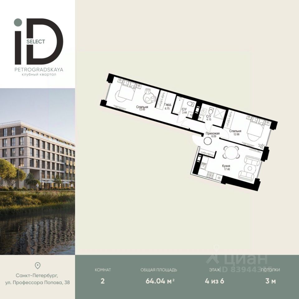 продам 2-к, Профессора Попова, 3838 424 000 ₽