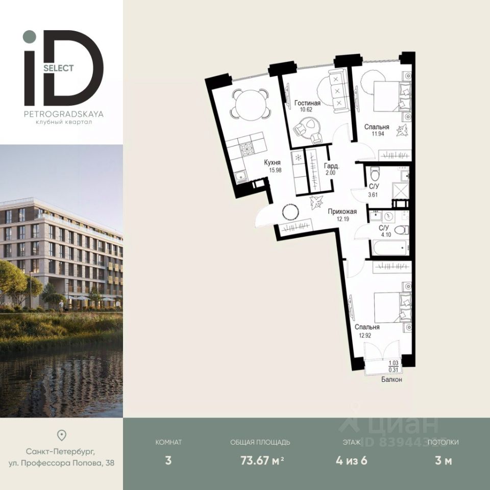 Клубный квартал iD Petrogradskaya на ул. Профессора Попова, 38 объединяет современную архитектуру, удобные планировки и развитую инфраструктуру, предлагая комфортную жизнь в престижном районе Санкт-Петербурга. Из квартир открываются виды на Иоанновский монастырь и реку Карповку. В шаговой доступности три станции метро: ''Петроградская'', ''Чкаловская'' и ''Чёрная речка''. 3-метровые потолки и эксклюзивные планировки создают атмосферу простора и уюта. Внутреннее пространство квартала включает благоустроенные дворы, курдонёры и подземный паркинг. Квартиры площадью от 20 до 136 м² с кухнями-гостиными до 40 м² и террасами с панорамными видами сдаются без отделки, оставляя свободу для индивидуальных интерьерных решений.