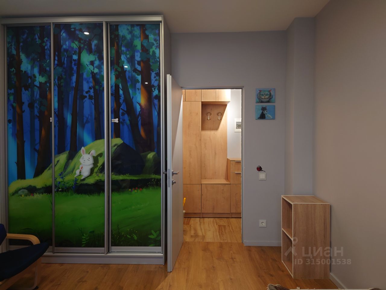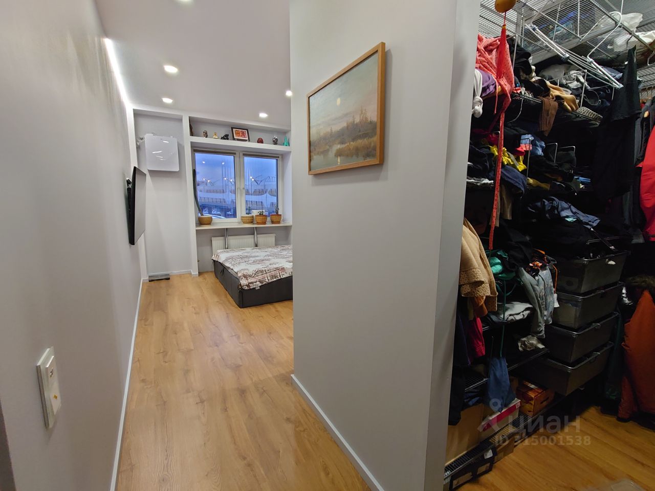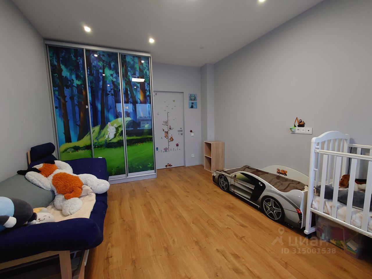Вторая комната (детская) площадью 16.8 м2 лаконична по меблировке: шкаф-купе и система хранения по периметру окна.