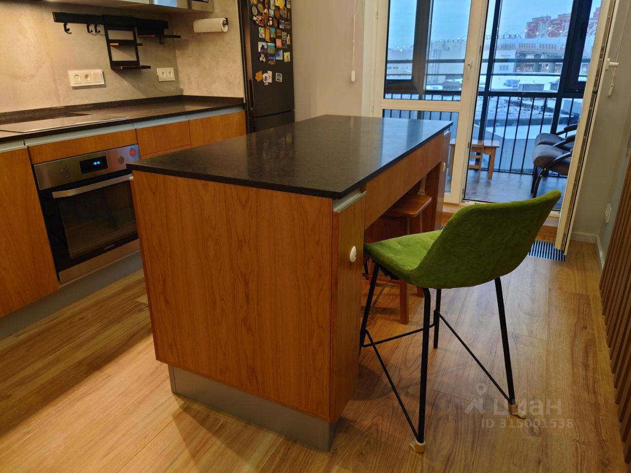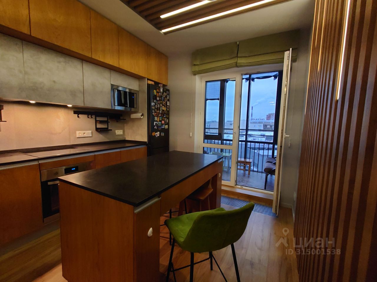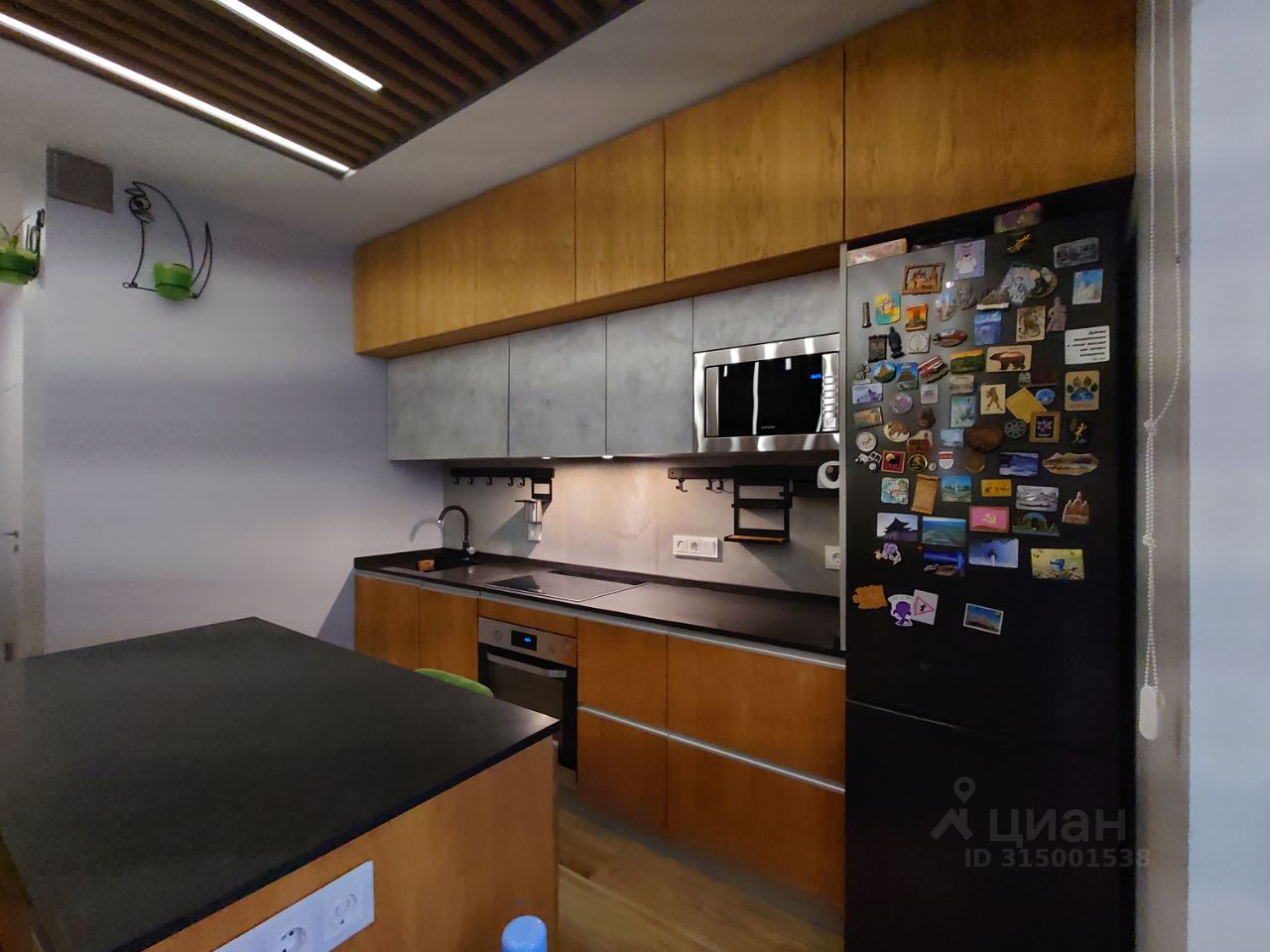 3. Кухонный гарнитур, повторяющий основные фактуры дизайна квартиры с отдельно стоящим холодильником, размещённом в нише.