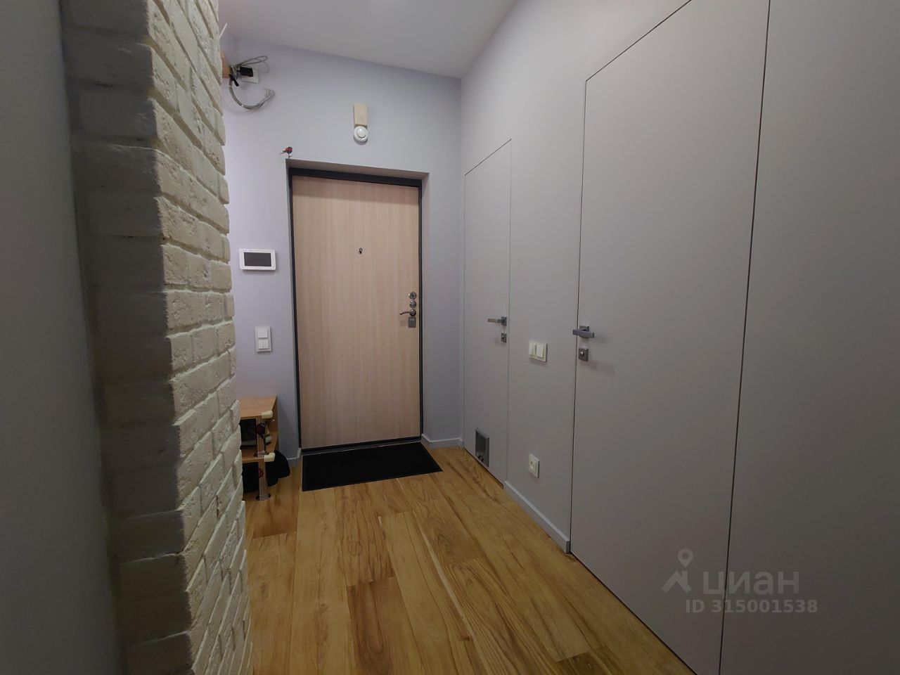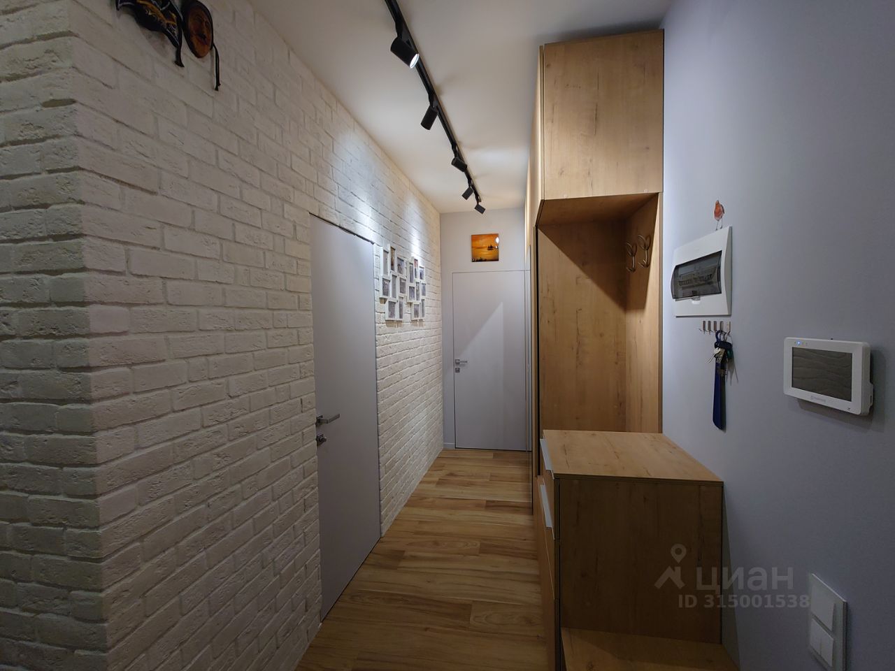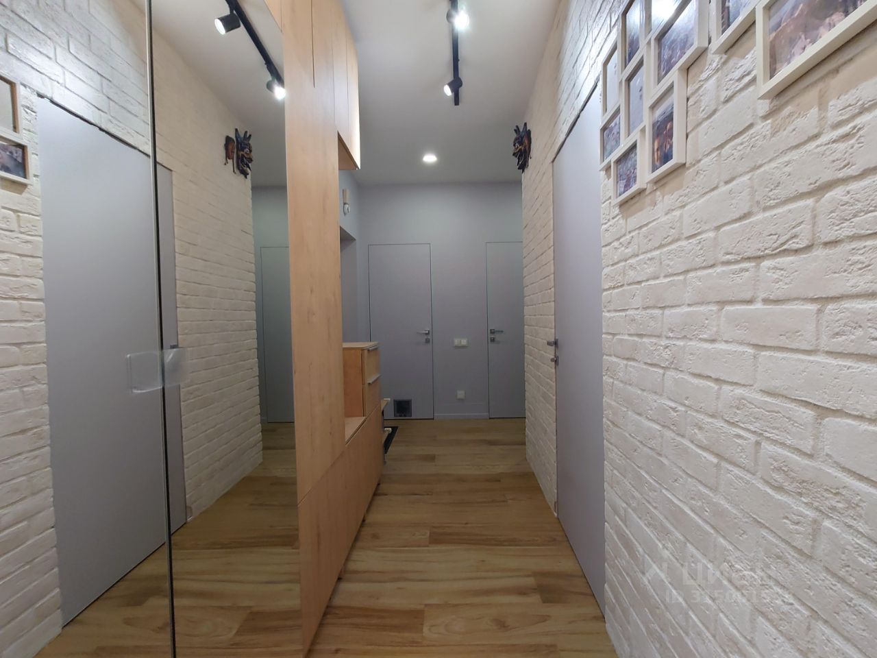 Одна стена прихожей оформлена в белом кирпиче. Вдоль другой стены расположен высокий шкаф-купе в древесных оттенках.