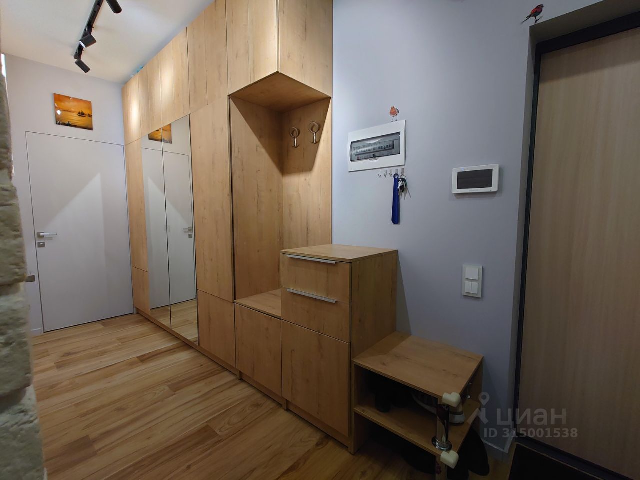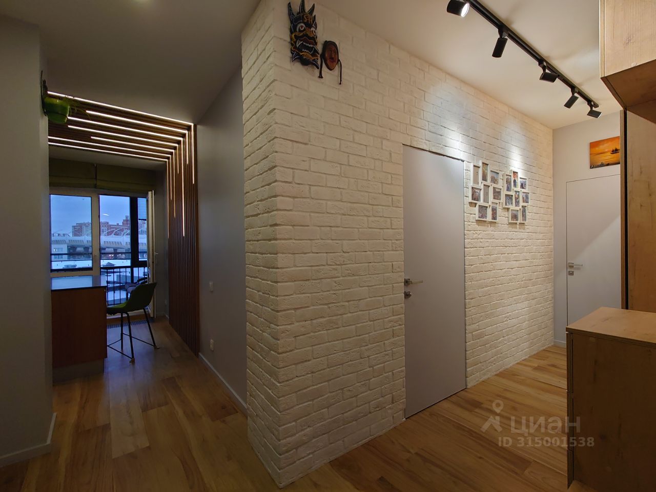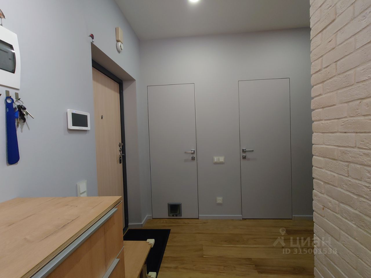 Одна стена прихожей оформлена в белом кирпиче. Вдоль другой стены расположен высокий шкаф-купе в древесных оттенках.