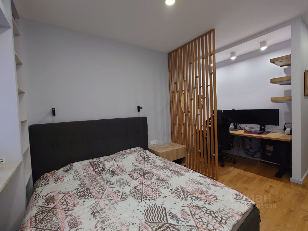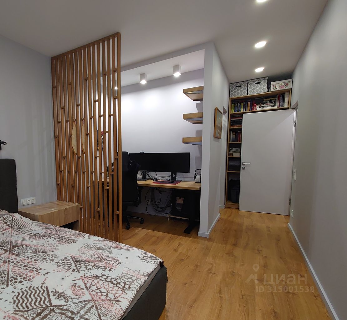 Большая комната общей площадью 20.1 метра разделена на три зоны: зона отдыха, рабочий кабинет с большим стационарным столом и своей системой специального освещения и гардеробная 3.5 м2 . По периметру окна сформирована незаметная система хранения, имитирующая оконные ниши.