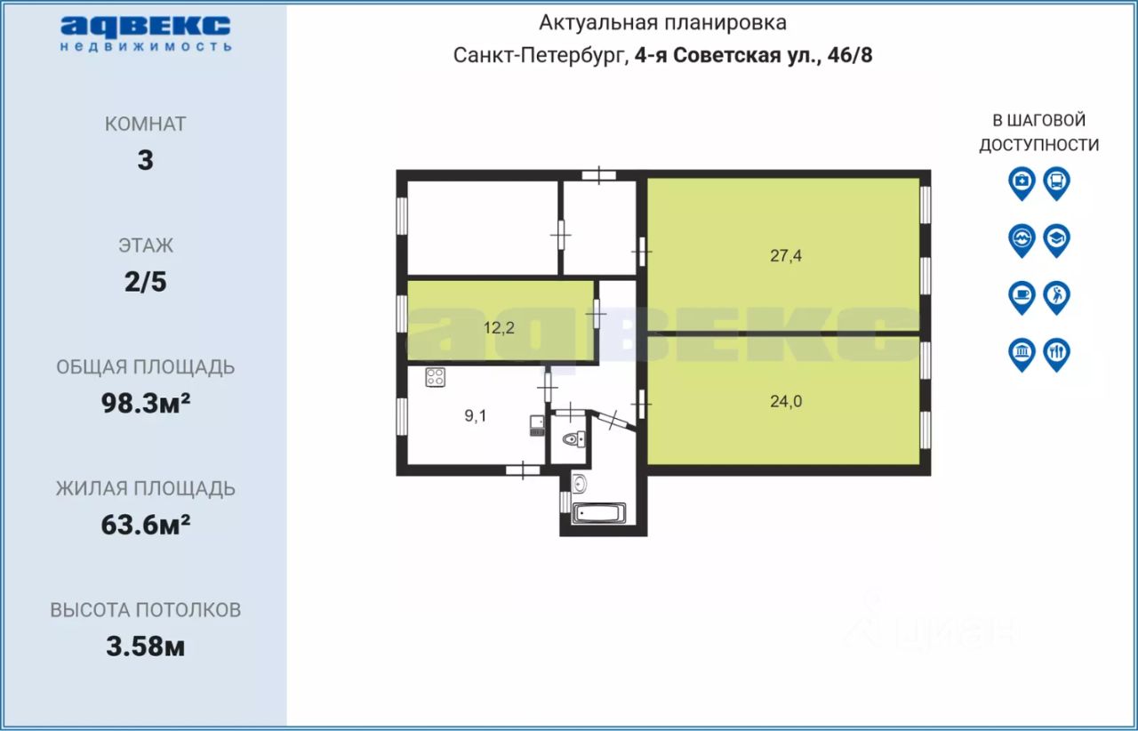 О квартире: 3 отдельные комнаты (27,4 м. + 24 м. + 12,2 м.) в 4-комнатной квартире Высота потолков 3,58 м. простор и благородство старинного дома 2 входа парадный и через черную лестницу (удобно для съема) Частичный ремонт: - Современный санузел с кафелем и новой сантехникой - Пластиковые окна - Новые радиаторы