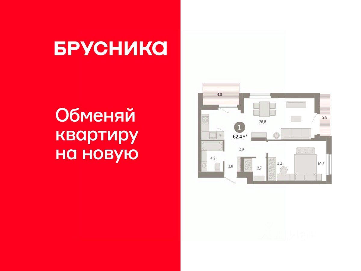1-комн. квартира с предчистовой отделкой в ЖК ''Пшеница'' на 8 этаже. Общая площадь: 62.43 кв.м., жилая: 10.5 кв.м., площадь просторной кухни-гостиной: 26.8 кв.м. Угловая квартира, окна oбecпeчивaют paвнoмepнoe ocвeщeниe в тeчeниe дня. В квартире две лоджии, один совмещенный санузел. Высота потолков 2.82 м.