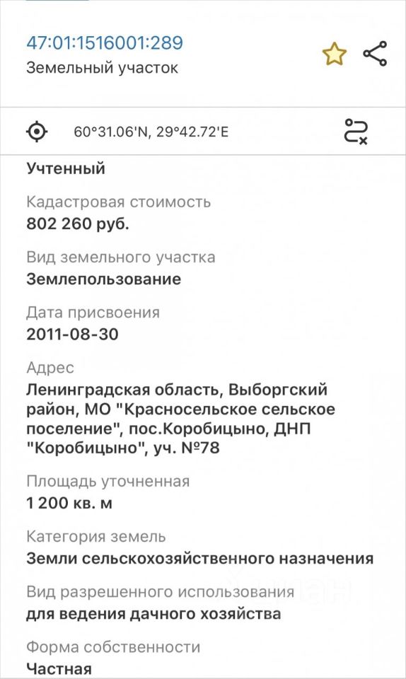 337004 192 Предлагается в продажу земельный участок Лен.обл. Выборгский р-н. п.Коробицыно ДНП 'Коробицыно' уч.78 12 соток. Собственность от 2019г. Участок крайний к лесу, ровный, сухой. Дорога к участку сделана. Эл-во 15 квт подключено (лицевой счет).Вода(надо бурить скважину или колодец). Дороги в посёлке отлично отсыпаны, проблем с подъездом нет, взносов ежемесячных нет( планируют сборы на дороги и шлагбаум), на въезде камеры, ведётся круглосуточное видеонаблюдение. Категория земли -сельскохозяйственного назначения, разрешенное использование-для ведения данного хозяйства. Кадастровый номер:47:01:1516001:289. До горнолыжных курортов 5 минут на машине 'Красное озеро' Золотая Долина 'Снежный.