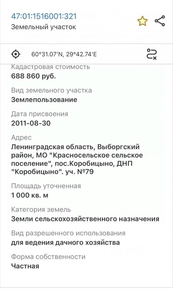 336972 Предлагается в продажу земельный участок Лен.обл. Выборгский р-н. п.Коробицыно ДНП 'Коробицыно' уч.79 10 соток. Собственность от 2019г. Участок крайний к лесу, ровный, сухой. Дорога к участку сделана. Эл-во 15 квт подключено (лицевой счет).Вода(надо бурить скважину или колодец). Дороги в посёлке отлично отсыпаны, проблем с подъездом нет, взносов ежемесячных нет( планируют сборы на дороги и шлагбаум), на въезде камеры, ведётся круглосуточное видеонаблюдение. Категория земли -сельскохозяйственного назначения, разрешенное использование-для ведения данного хозяйства. Кадастровый номер:47:01:1516001:321. До горнолыжных курортов 5 минут на машине 'Красное озеро' Золотая Долина 'Снежный.
