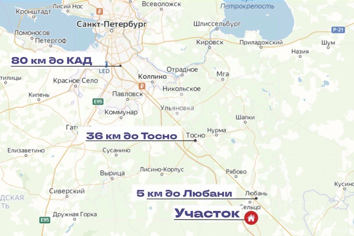 Транспортная доступность:До Санкт-Петербурга можно доехать на автомобиле по Московскому шоссе М-10 за 1 час, либо по скоростной трассе М-11 (съезд под г.Тосно)Электричка от станции Любань до г. Тосно, г. Колпино и СПб (время в пути до Московского вокзала 1 ч 30 мин)Автобусная остановка в пешей доступности до г. Любань можно доехать на автобусе 322 и 328, далее до станций метро Звездная, Шушары.Сделано межевание. Границы с соседями согласованы.