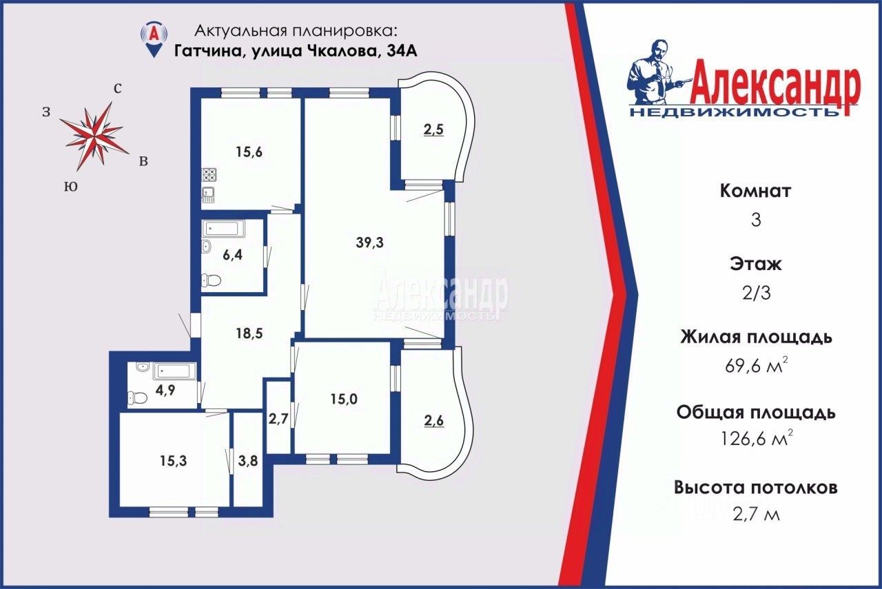 1695549 Квартира ''Опен Спейс'' несущие стены только боковые + две балки посредине , с двумя большими балконами и косым видом на Приоратский дворец и парк, озеро Черное, центр города Гатчина.