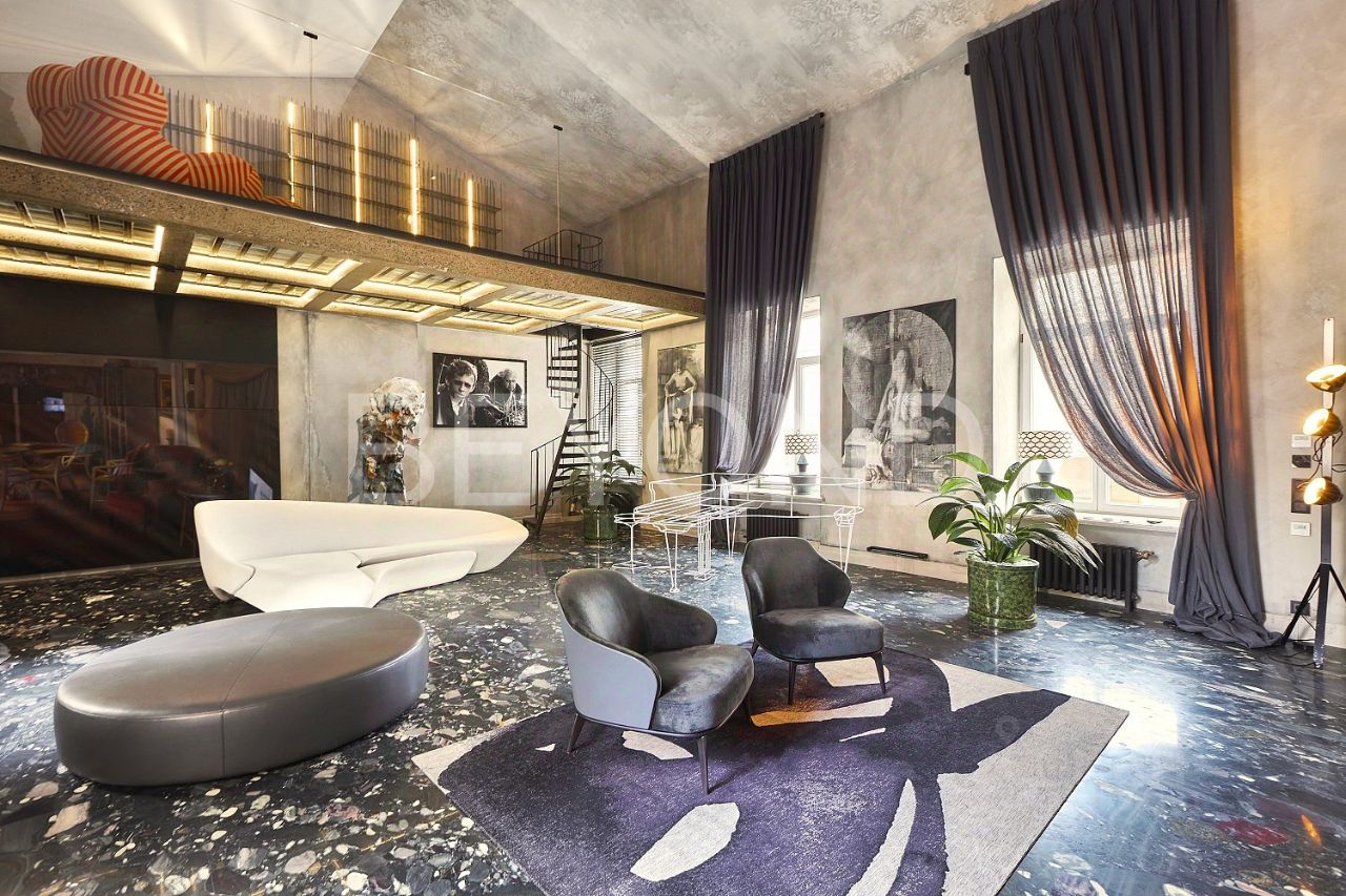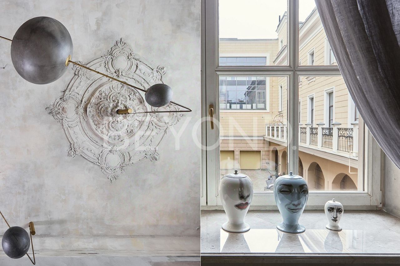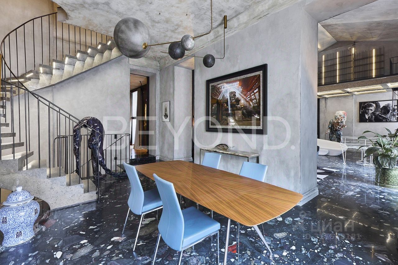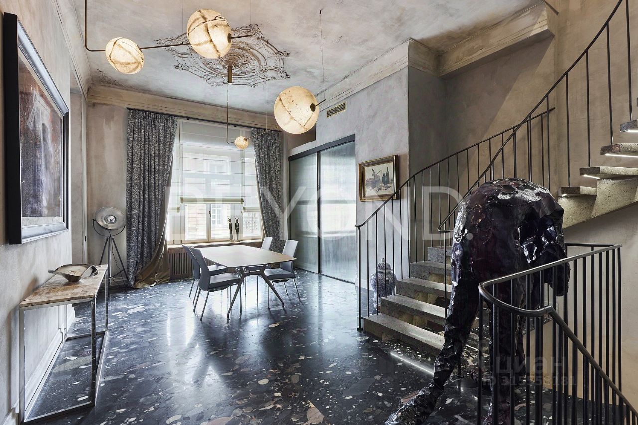 Три этажа пространства объединяет винтовая лестница - самостоятельный арт-объект. Интерьер квартиры построен на эффектных контрастах: прошлого и будущего, бетона и мрамора, изящной лепнины с благородной стариной и ультра-современных предметов освещения, бескомпромиссной практичности, инженерно-технического совершенства и эстетики в каждой детали интерьера - переосмысление идей прошлого в актуальном контексте современности. Квартира предлагается полностью готовой для комфортного проживания, включая предметы мебели, интерьера и характерного декора.