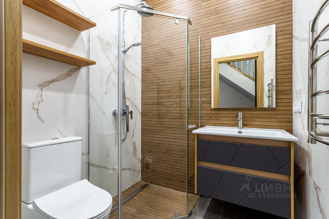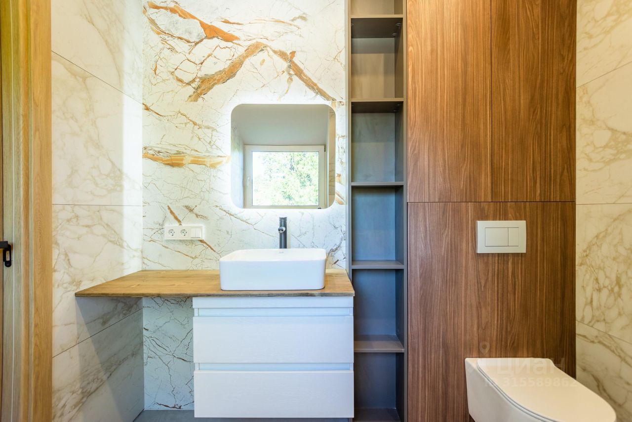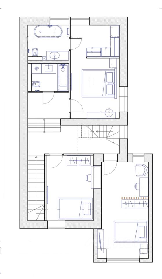 Планировка: на первом уровне: гараж (+техническая часть) 18,6 кв.м., холл 17,2 кв.м., гостевой с/у, кухня-гостиная 34,2 кв.м., гостевая комната, на втором уровне: спальня 12,7 кв.м., спальня 18,7 кв.м., с/у, холл 15,6 кв.м., мастер-спальня 11,8 кв.м. со своей гардеробной 6,2 кв.м. и с/у 5,8 кв.м, третий уровень: кабинет площадью 6 кв.м. Высокие потолки, вид из окон на сосны и ели.