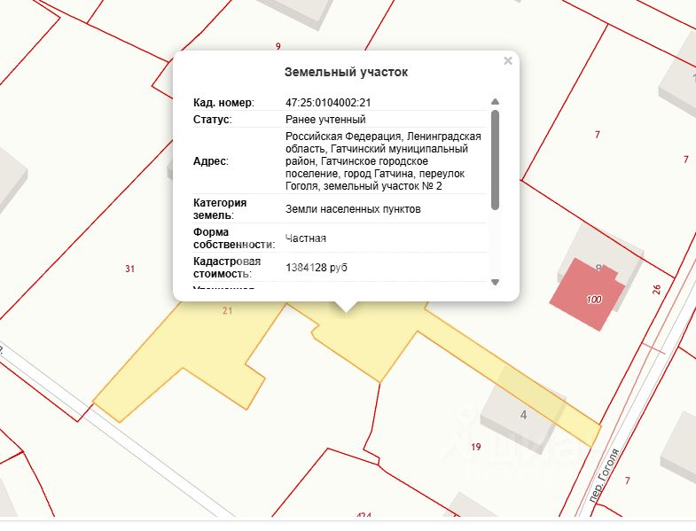 - *Площадь:* 12 соток - *Назначение:* ИЖС (индивидуальное жилищное строительство) - *Расположение:* Гатчина, Ленинградская область, развитая инфраструктура, удобный подъезд, тихий и экологически чистый район. - *Коммуникации:* Электричество 15 кВ, в поселке проведен газ. - *Участок:* Светлый, зеленый, ровный, сухой, у границы с участком находится пожарный водоем (что дает дополнительную площадь участку)