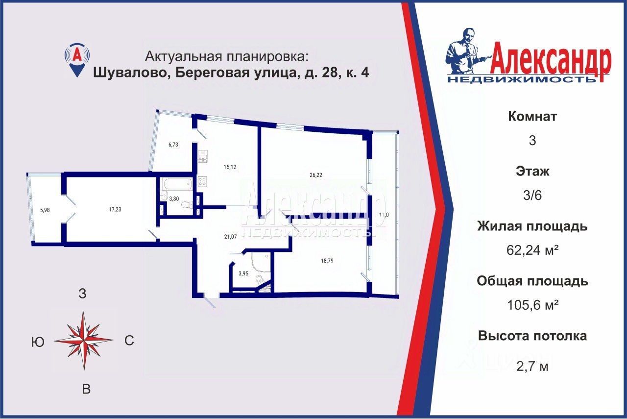 Планировка: Просторный холл — 21 м² Светлая гостиная — 26,2 м² Две отдельные комнаты — 18,7 м² и 17,2 м² Два санузла — для удобства всей семьи