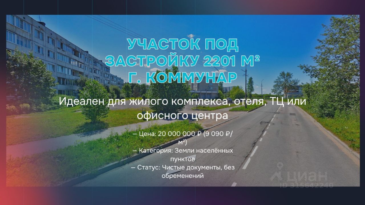 Продаётся участок под застройку в г. Коммунар (Гатчинский район) Кадастровый номер: 47:24:0102004:4637 Площадь: 2201 м² Цена: 10 000 000 ? Категория земель: Земли населённых пунктов Статус: Актуальные сведения в ЕГРН, обременений нет