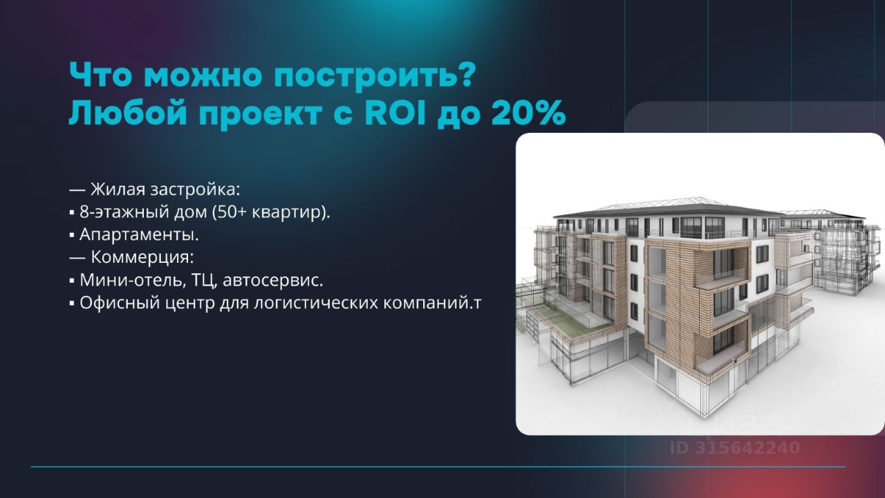 Ключевые преимущества: Универсальное назначение: — Жилая застройка (до 8 этажей, апартаменты). — Коммерция (офисный центр, мини-отель, торговый комплекс). — Свободное использование (склад, автосервис, производство).