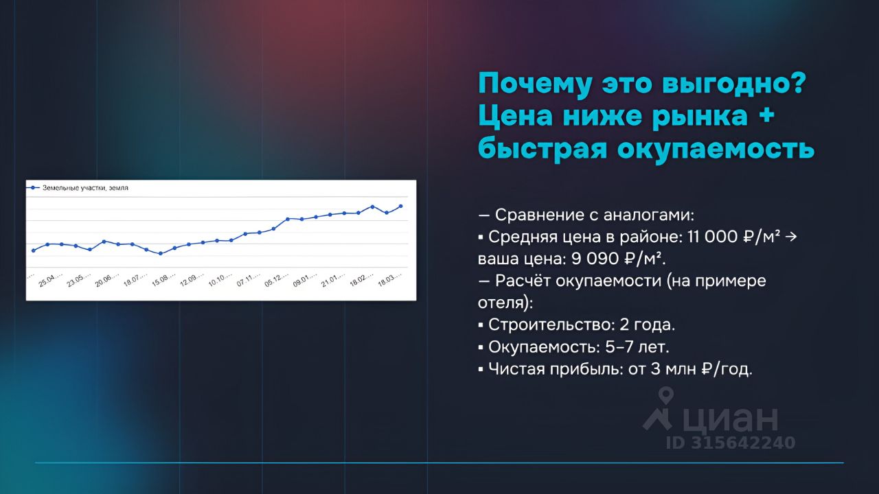 Почему этот участок? — Идеален для девелоперов: Площадка под многоэтажную застройку. — Для бизнеса: Готовый трафик с трассы — клиенты уже здесь! — Для инвесторов: Цена ниже среднерыночной в локации (аналоги от 11 000 ?/м²).