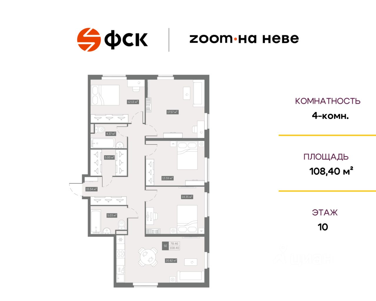 Цена со скидкой до 30% в прямой продаже от застройщика — только в этом месяце. При покупке апартаментов - паркинг за полцены. На все апартаменты действует беспроцентная рассрочка. Купите на распродаже! Покупка недвижимости в Zoom на Неве сейчас со скидкой до 30% позволит через 2 года получить доход до 6 300 000 руб. Роскошные виды на Неву. 4-к апартамент в комплексе класса бизнес-лайт Zoom на Неве на 10-м этаже. Общая площадь 108,7. Без отделки.