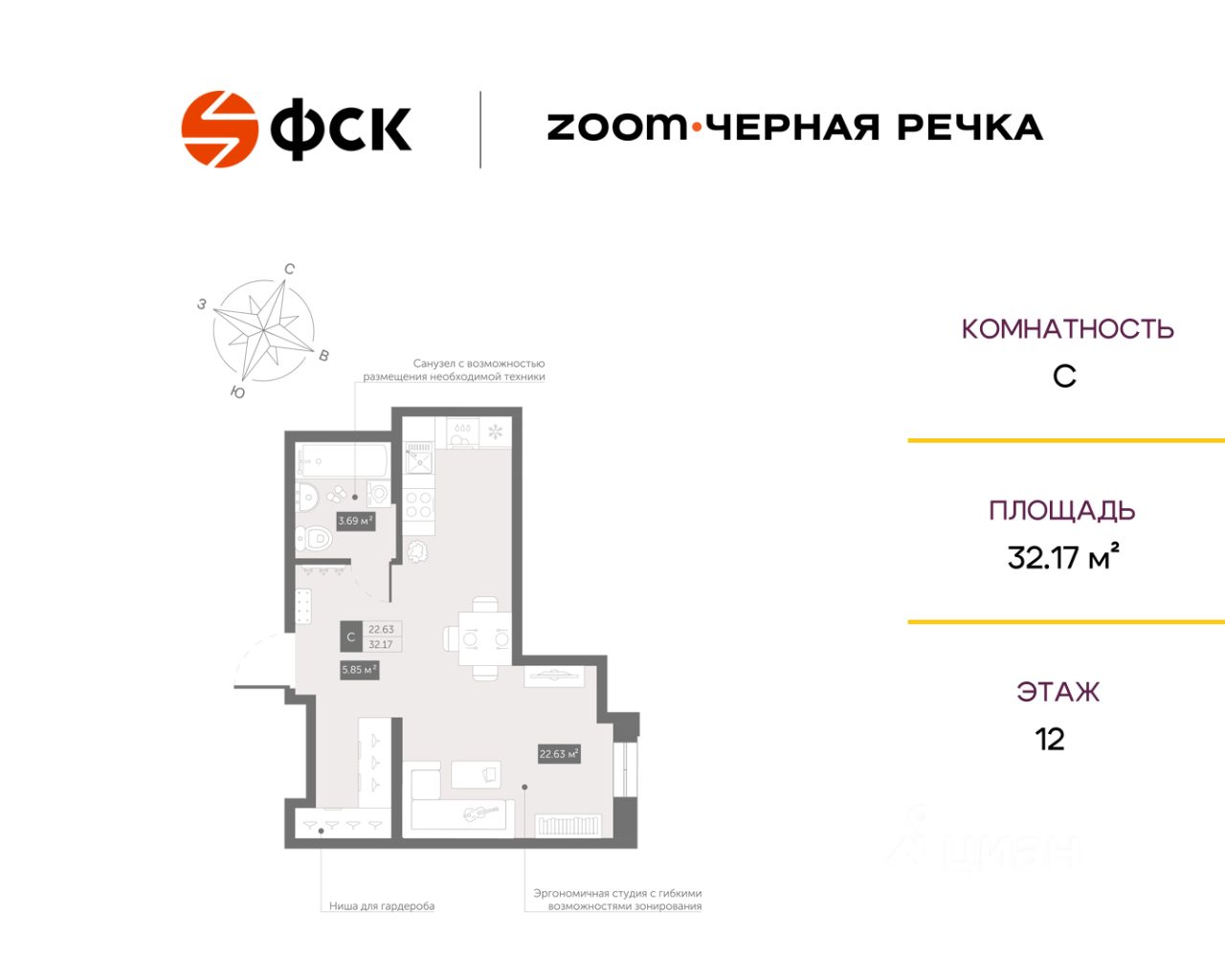 Цена со специальной скидкой в прямой продаже от застройщика — только в этом месяце. Апартамент-студия в комплексе класса бизнес-лайт Zoom Чёрная Речка на 12-м этаже. Общая площадь 32,17. Чистовая отделка.