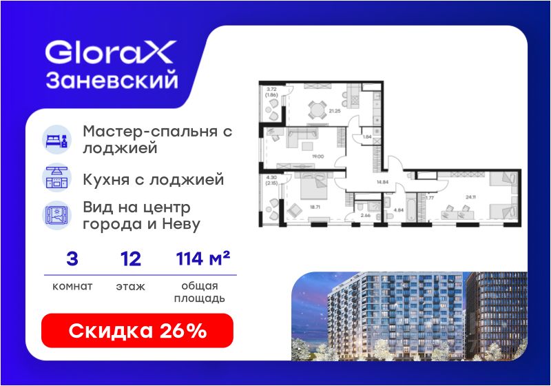 GloraX Заневский — для тех, кто выбирает жизнь без уступок. Всего две минуты до метро ''Ладожская'', пять парков в шаговой доступности, закрытый двор с разновозрастной детской зоной, комьюнити-центр и отапливаемый паркинг с лифтом прямо с этажа. Вокруг — всё, что делает город живым: рестораны, ТЦ, кинотеатры и прогулочные бульвары.