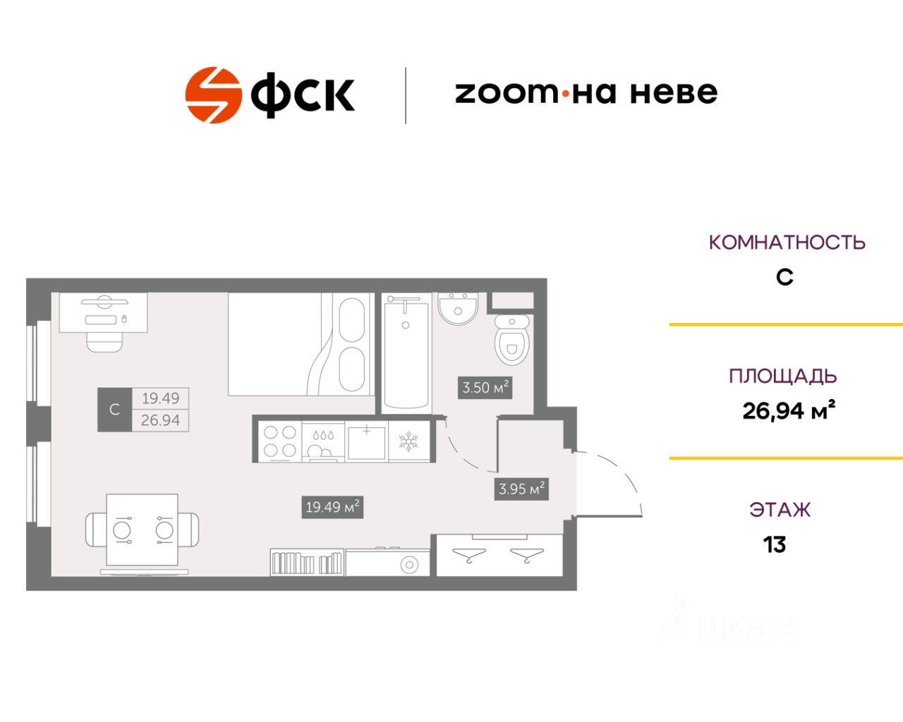 Цена со скидкой до 30% в прямой продаже от застройщика — только в этом месяце. При покупке апартаментов - паркинг за полцены. На все апартаменты действует беспроцентная рассрочка. Купите на распродаже! Покупка недвижимости в Zoom на Неве сейчас со скидкой до 30% позволит через 2 года получить доход до 6 300 000 руб. Роскошные виды на Неву. Апартамент-студия в комплексе класса бизнес-лайт Zoom на Неве на 13-м этаже. Общая площадь 26,94. Предчистовая отделка.