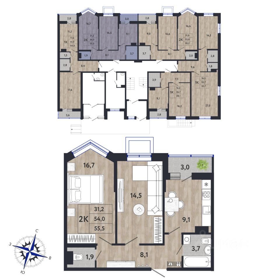 ПРО КВАРТИРУ: В квартире удобная прихожая 8,1 кв.м., кухня 9,1 кв. м., комнаты по 16,7 и 14,5 кв.м., санузел раздельный 1,9 и 3,7 кв. м., балкон 3,0 кв. м. Площадь без учета балкона 54,0 кв.м. Приведенная 55,5 кв. м. С учетом балкона 57 кв.м.