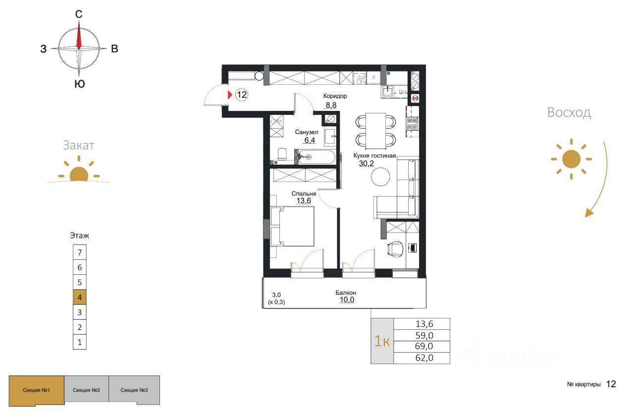 Общая площадь62 м2