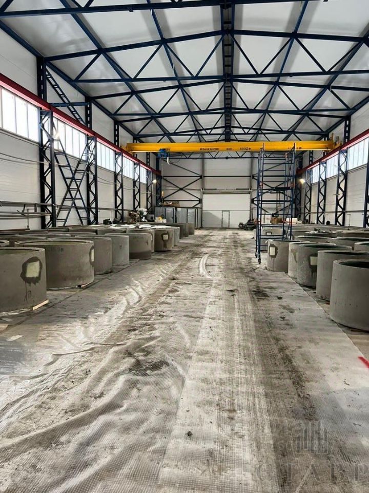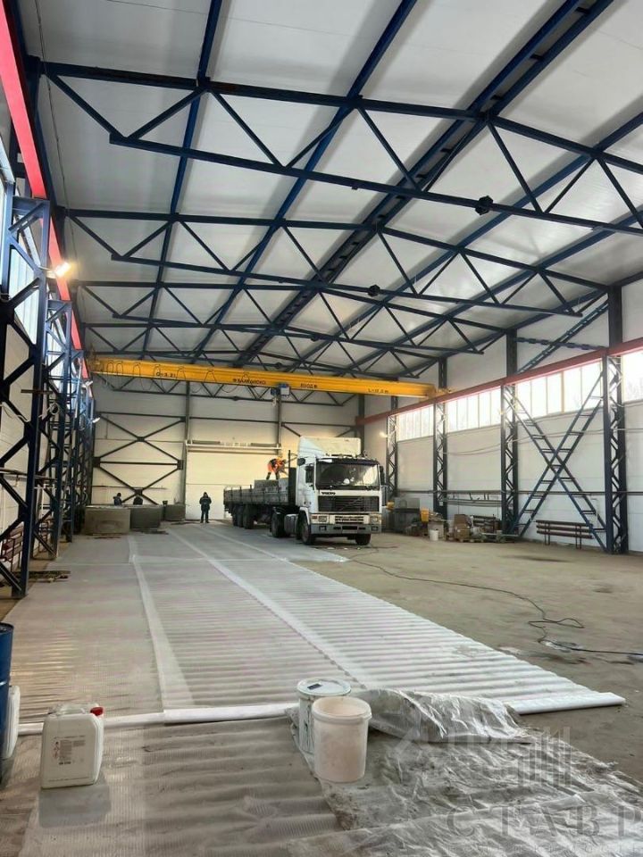 Ангар высотой 11 м. Ангар - 864 кв м. Участок полностью выровнен, заезд и выезд замощен бетонными плитами.