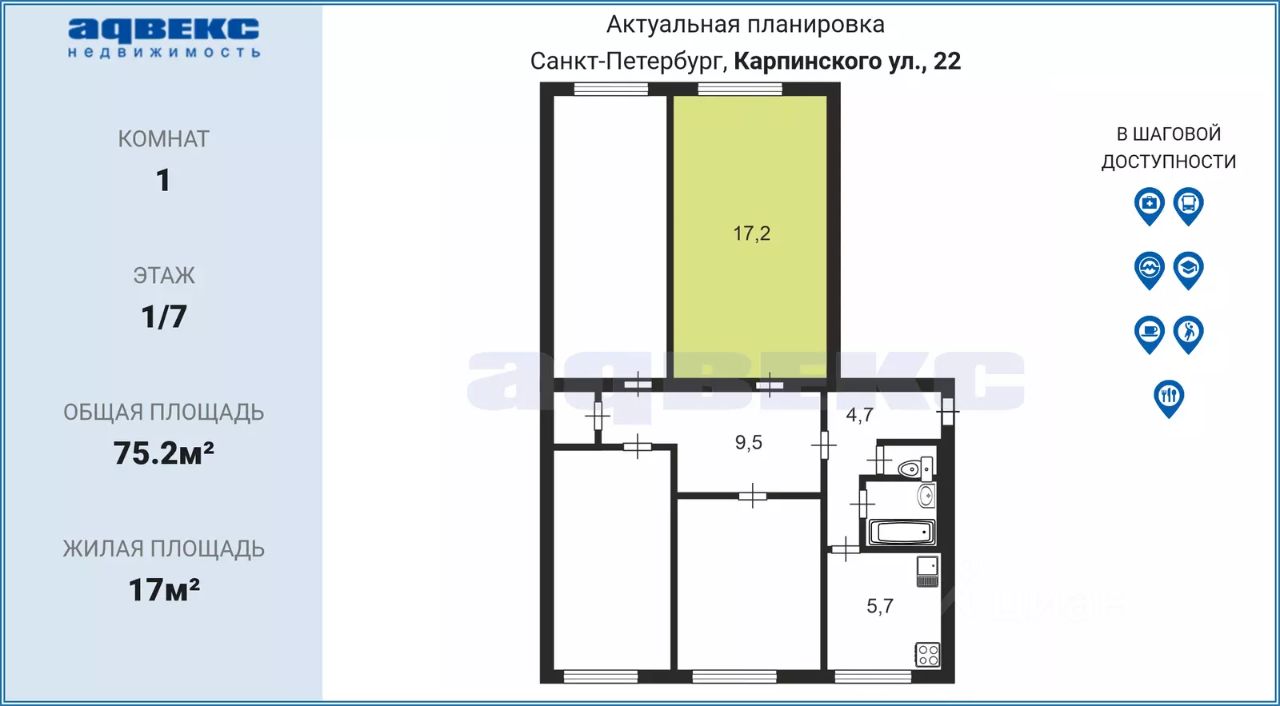 Продаем комнату 17 м кв, самая большая в 4-х комн квартире. Комната светлая, теплая, чистая. Квартира мало населённая. Перспективная,