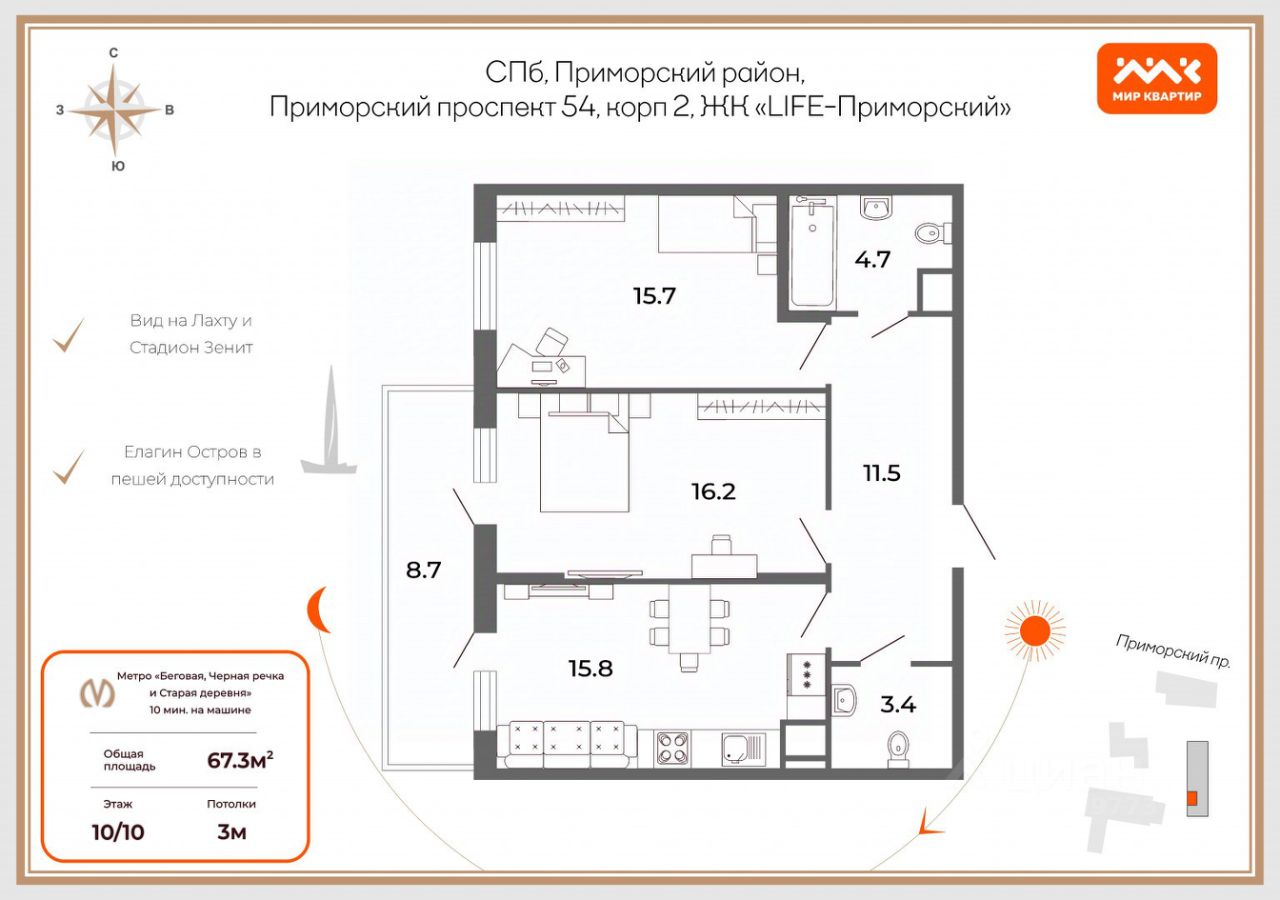 Квартира расположена на 10 этаже, с шикарным видом на Лахта центр, стадион Газпром арена и Большую Невку.