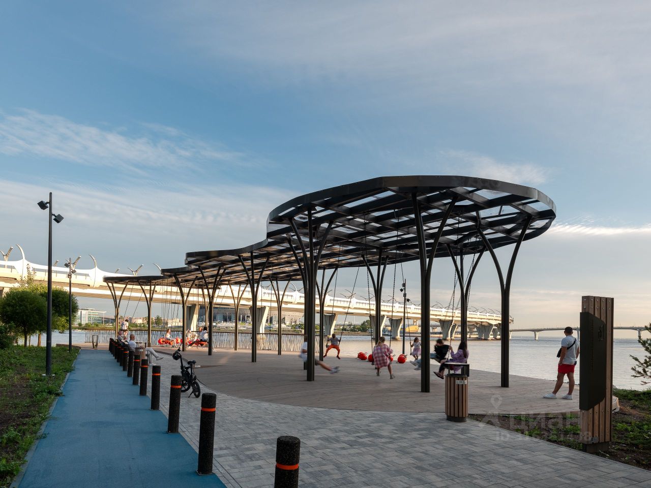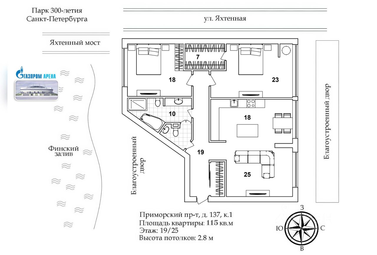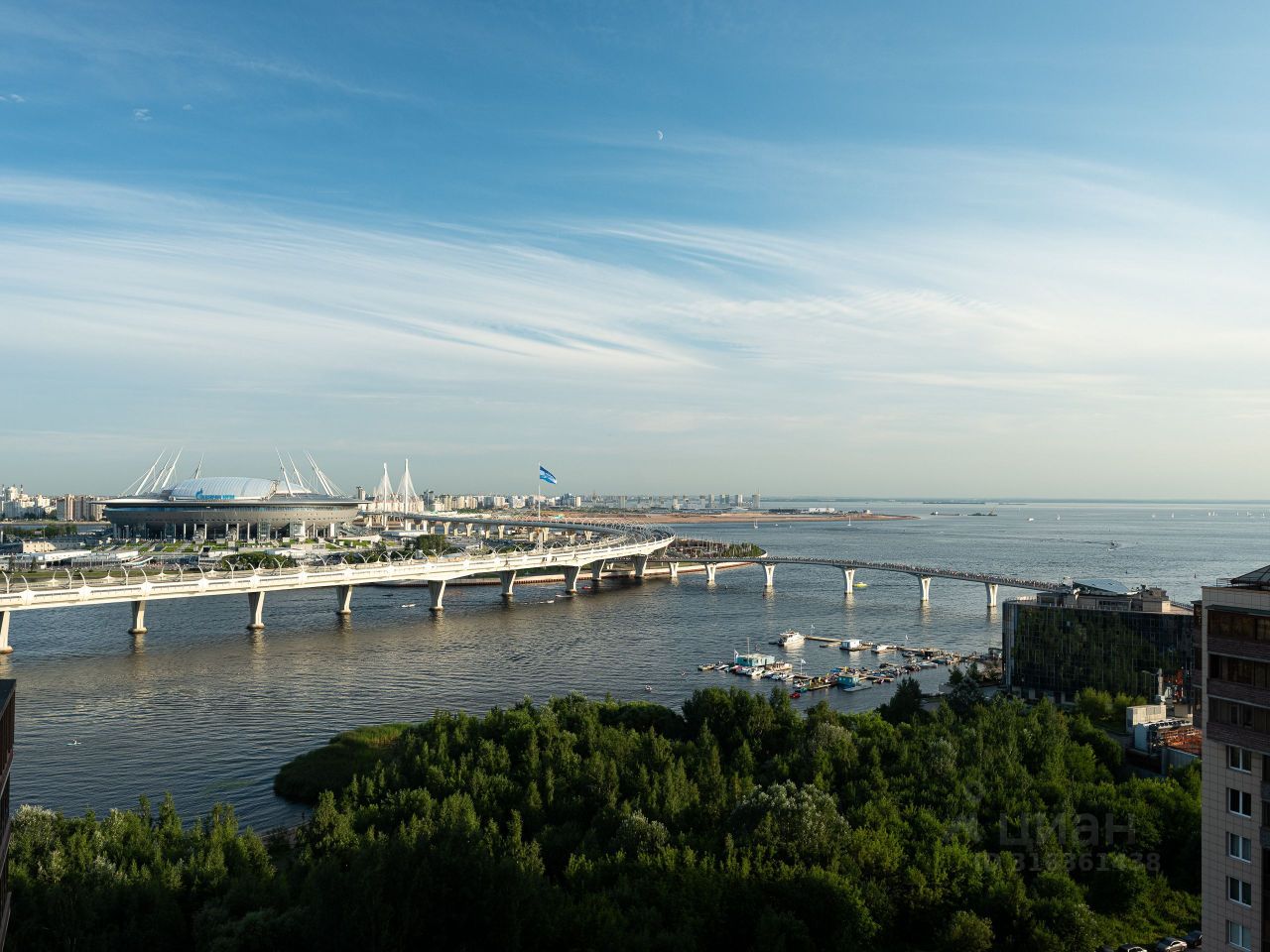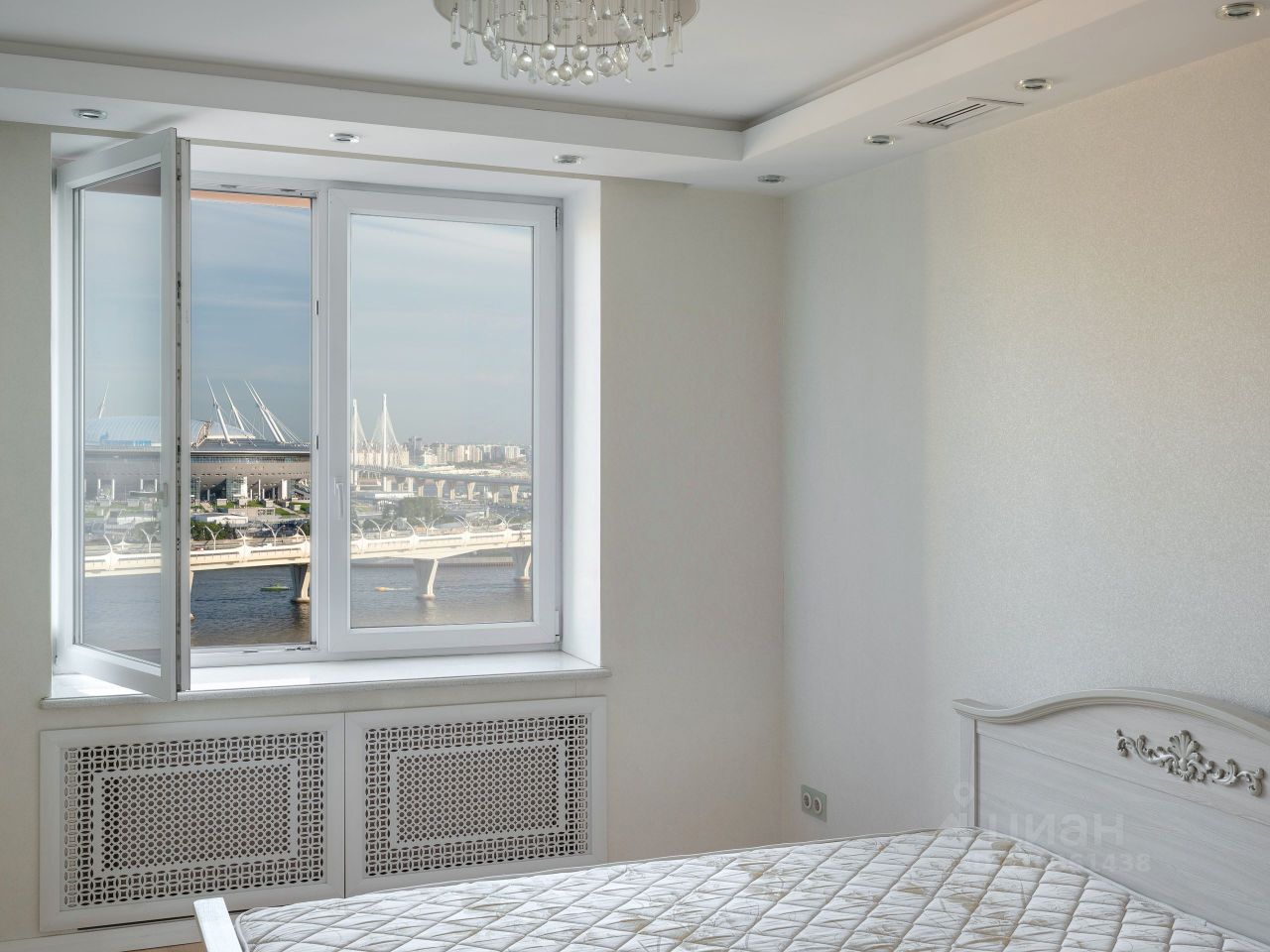 Из окон квартиры открывается вид на: Финский залив, Газпром-Арену, Яхтенный мост и благоустроенный двор. Особенно красивы виды в вечернее время, когда город включает ночное освещение и иллюминацию.