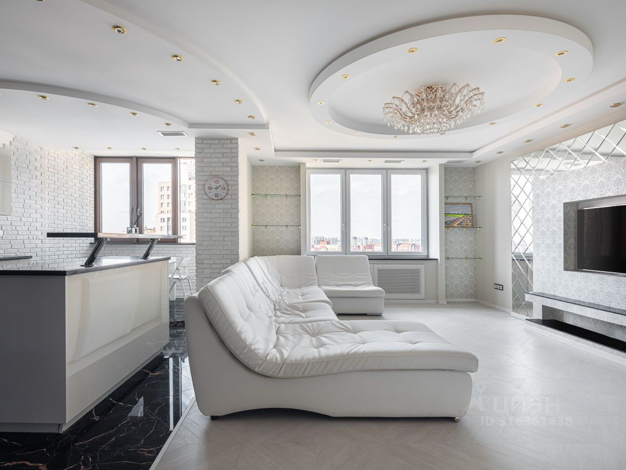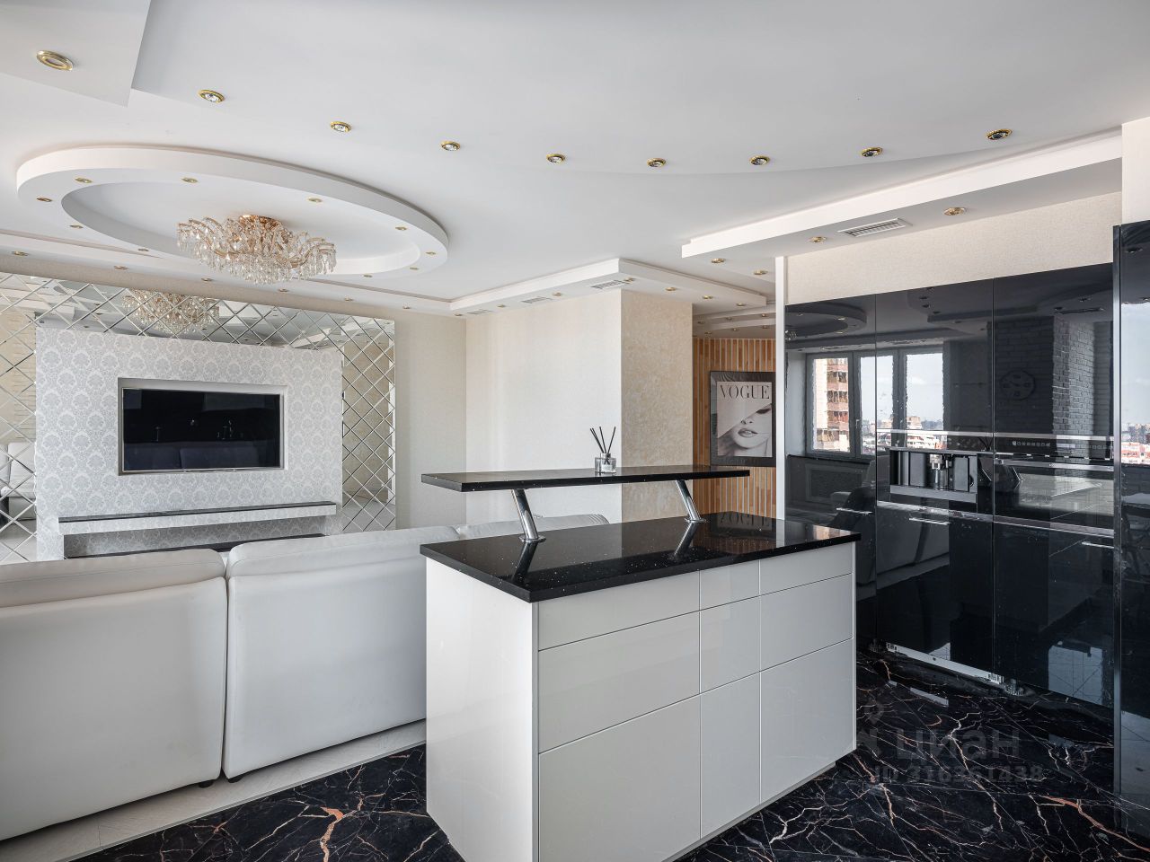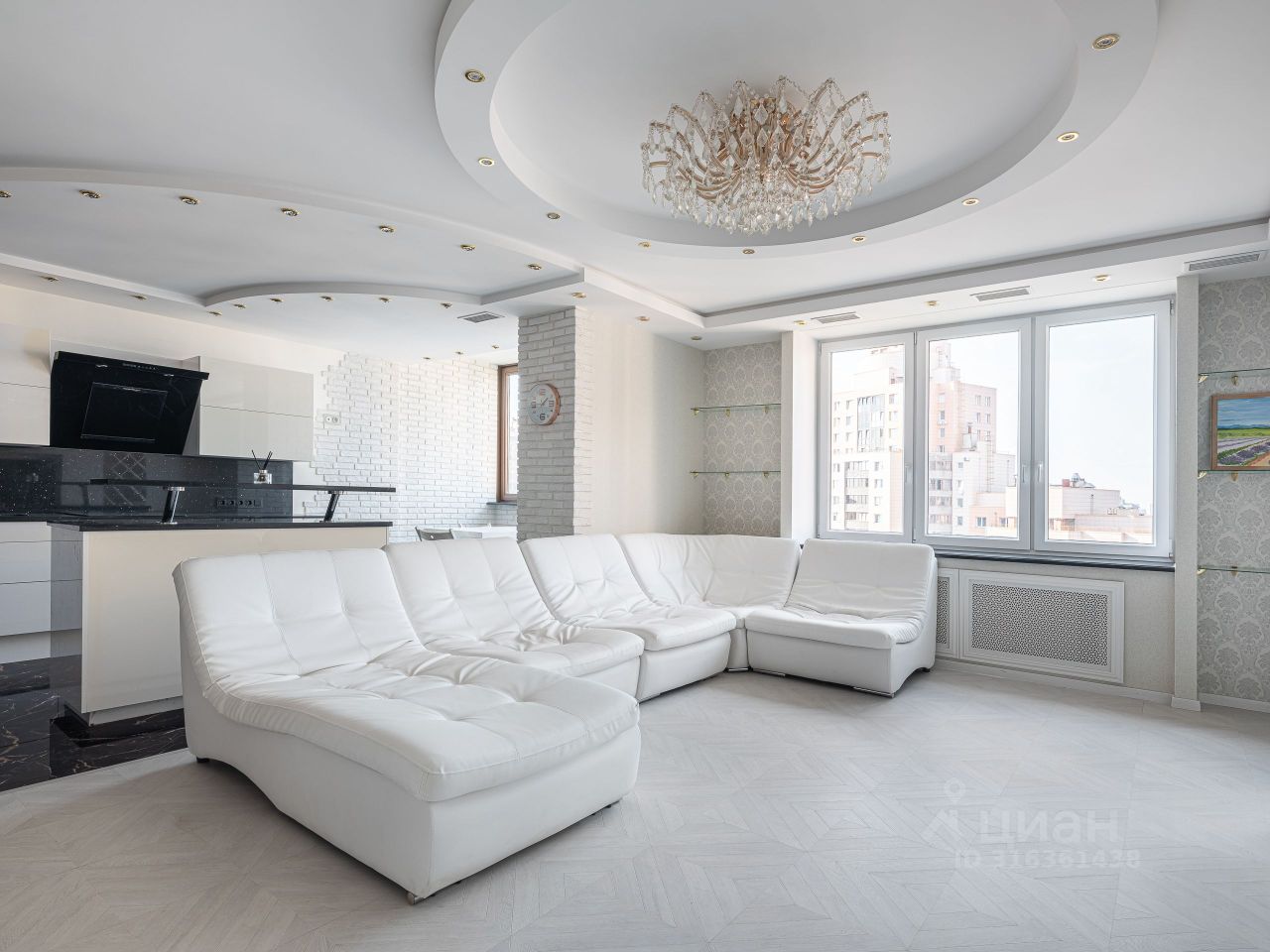 Квартира имеет удачную планировку и грамотно зонирована. Просторная и светлая кухня-гостиная разделена на зону приготовления пищи и пространство для приема гостей.