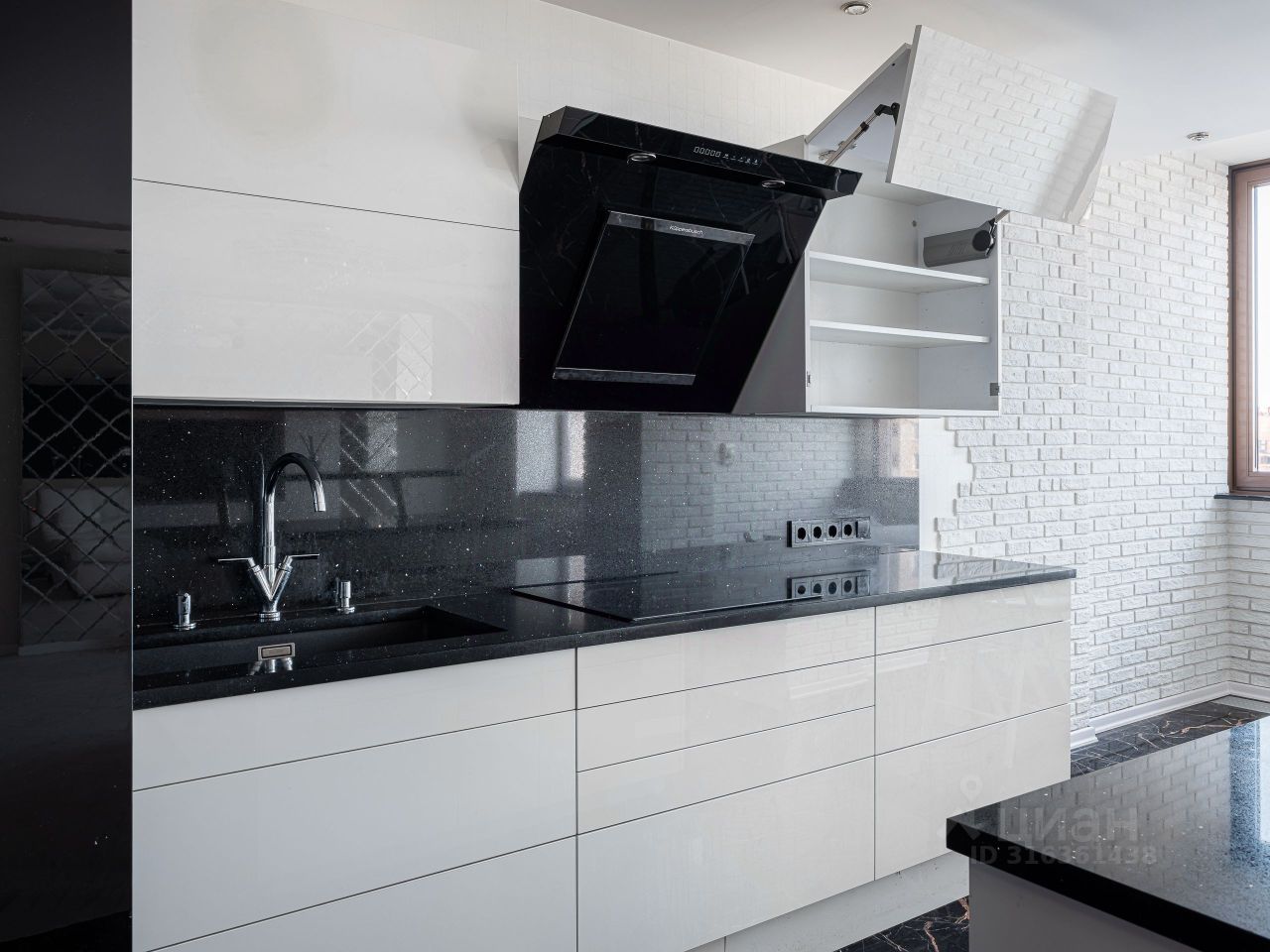 Кухня оснащена всей необходимой мебелью и техникой: немецкая кухня Rational с системой доводчиков Blum, духовой шкаф с функцией микроволновой печи Kuppersbusch, варочная панель Neff, посудомоечная машина Bosch, встроенные холодильник и морозильная камера Liebherr, вытяжка Kuppersbusch.