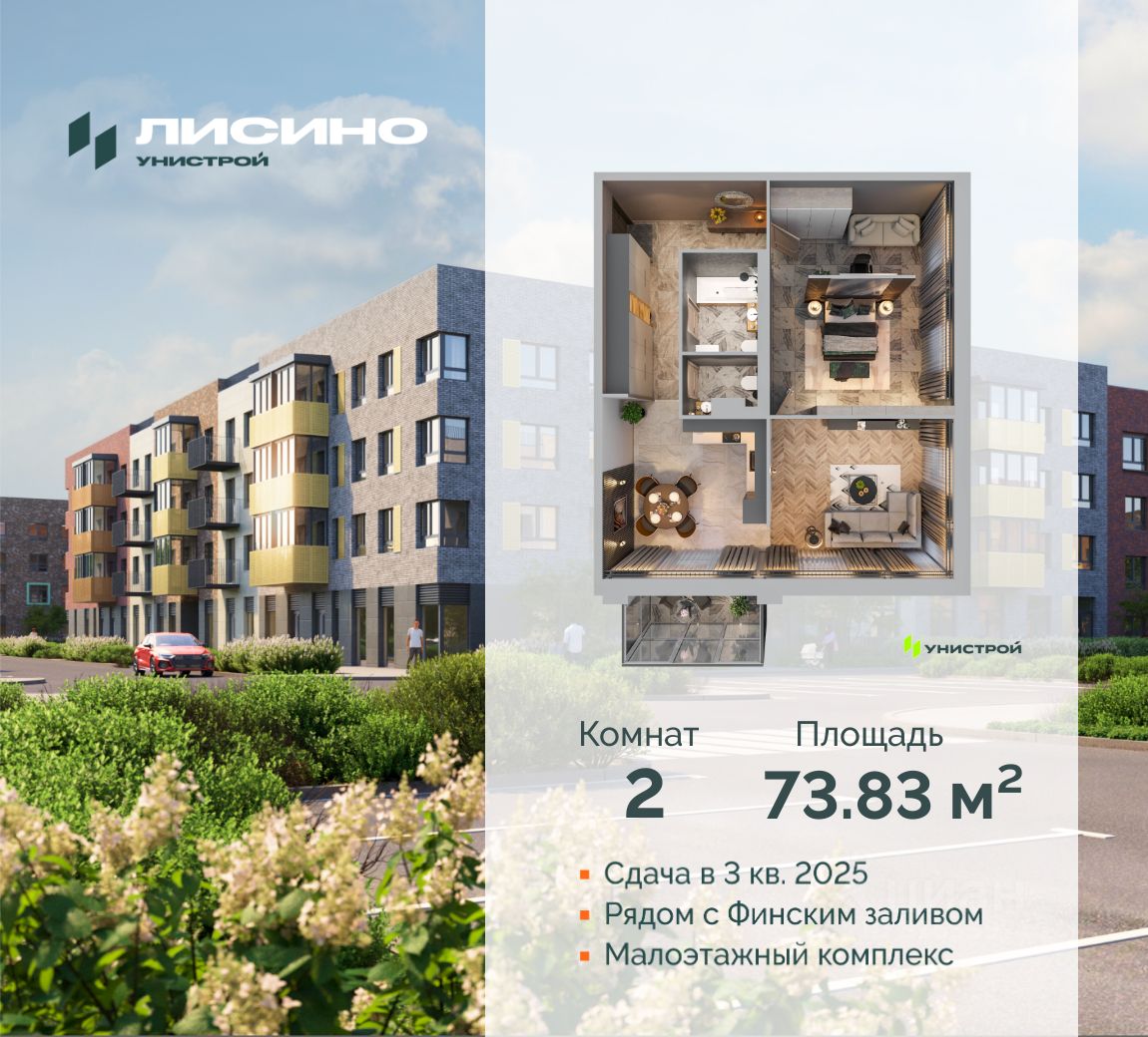 Лисино ''Лисино'' город-парк в Курортном районе Санкт-Петербурга от компании ''Унистрой''. Рядом Финский залив, экопарк, озеро, а также самый высокий небоскреб в Европе. Комплекс отличает чистый воздух, малоэтажная застройка, фасады из клинкерной плитки, уютные дворы, прогулочный бульвар, парковые зоны. Представлено разнообразие планировок: от студий, до двухуровневых квартир. Живите там, где другие отдыхают Город-парк ''Лисино'' находится в Курортном районе Санкт-Петербурга, в 15 минутах езды по Приморскому шоссе от станции метро ''Беговая''. Рядом Финский залив с благоустроенным пляжем, экопарк, озеро Сестрорецкий разлив и ''Лахта Центр''. Локация славится морским воздухом и хвойными лесами.