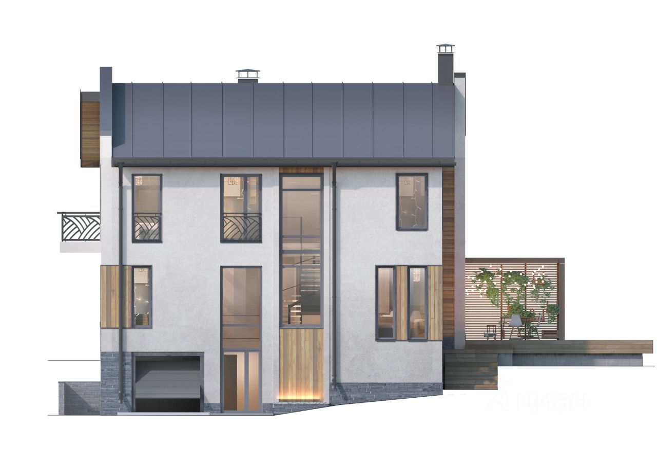 - Домовладение для разного состава семей - Фасадная штукатурка с инкрустацией клинкерной плиткой - Просторная кухня-гостиная с зоной столовой, панорамными окнами и выходом на террасу - Цокольный этаж, сауна и утепленный гараж - Мастер-спальня с отдельной рабочей зоной или для бьюти-корнера - Теплые полы