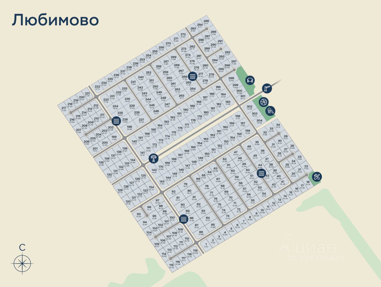 КОММУНИКАЦИИ И ИНФРАСТРУКТУРА ПОСЁЛКА: Электричество 15 кВт КПП, охрана Территория отдыха Детская и спортивная площадка Широкие дороги - асфальтная крошка, открытая система водоотведения Обслуживанием территории занимается профессиональная сервисная компания ''Гринлайн''