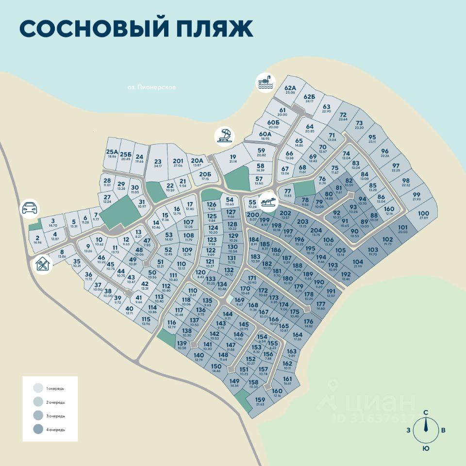 Коттеджный поселок у озера Пионерское занимает площадь в 35 Га и насчитывает 192 участка. Участки располагаются на первой береговой линии, и на них произрастают многовековые хвойные сосны.