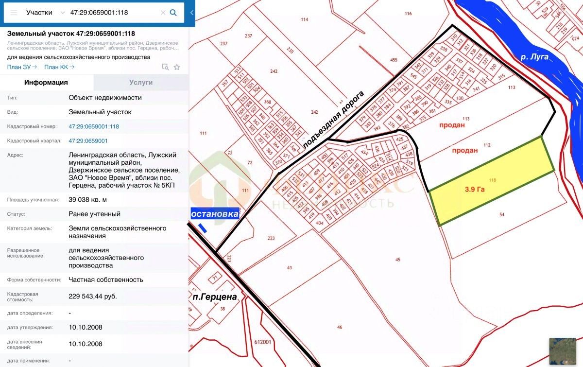 Ленинградская область, Лужский муниципальный район, Дзержинское сельское поселение, вблизи пос. Герцена, продам участок земли с/х 3.9 Га на берегу р.Луга