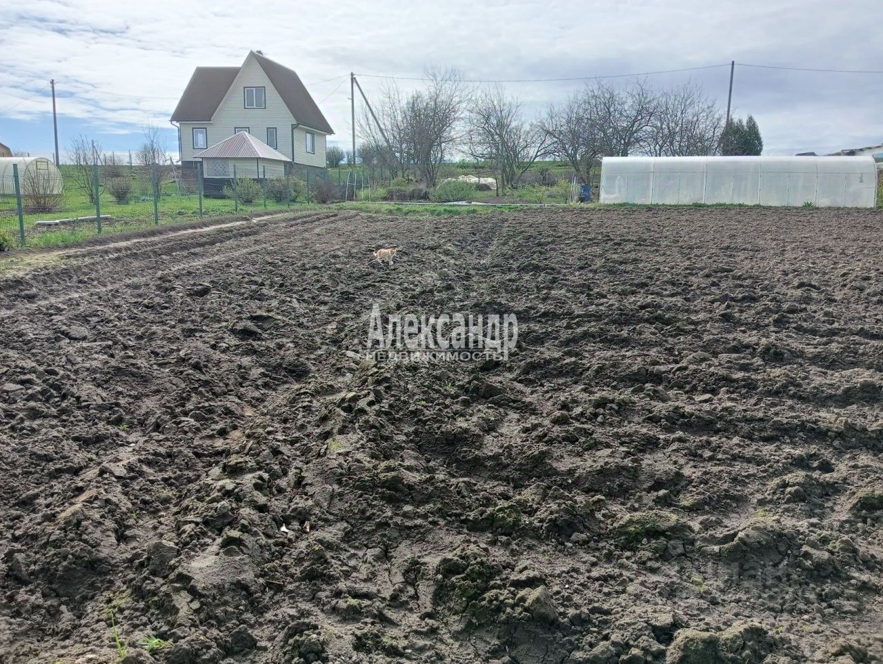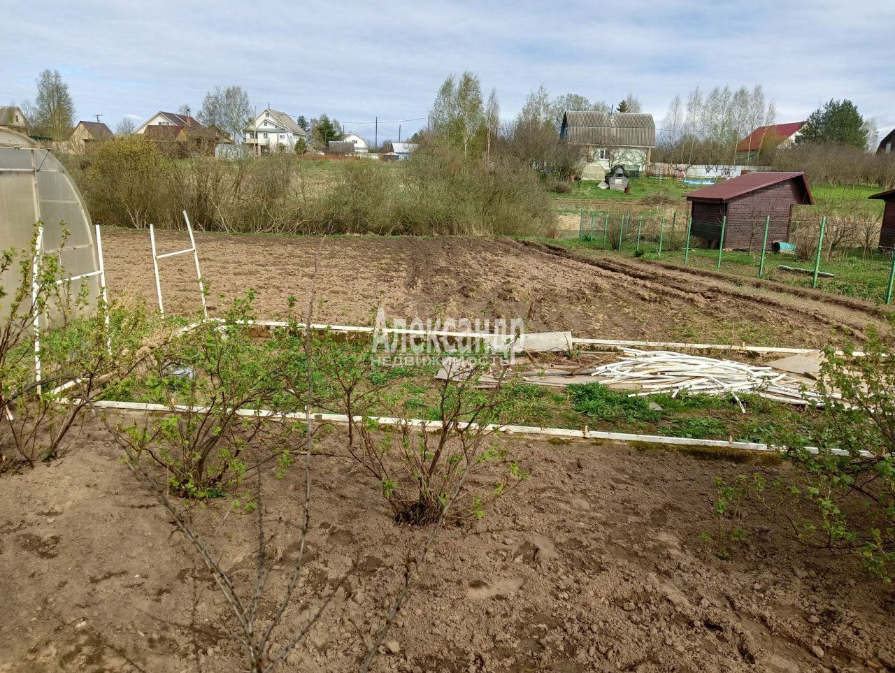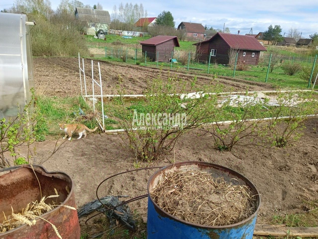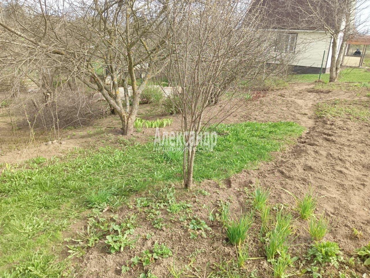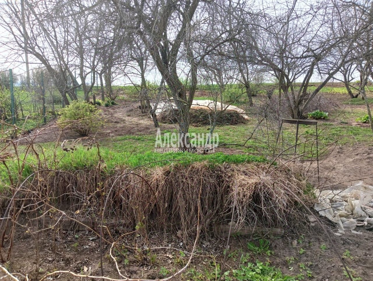 Участок огорожен только с одной стороны. Имеет вытянутую форму и небольшой уклон. Участок разработан, есть яблони, сливы, груши, смородина, клубника.