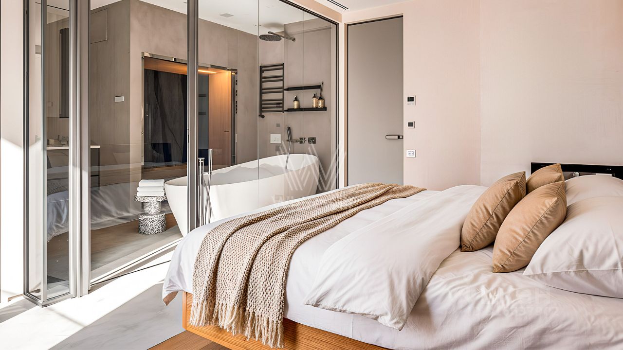 Спланирована кухня-гостиная-столовая с выходом на балкон, мастер-спальня с собственной ванной комнатой, огороженной стеклянной перегородкой, и гардеробной, кабинет, который можно оборудовать под спальню, санузел с душевой и постирочной зоной, собственный хамам, прихожая. Окна выходят в тихий двор.