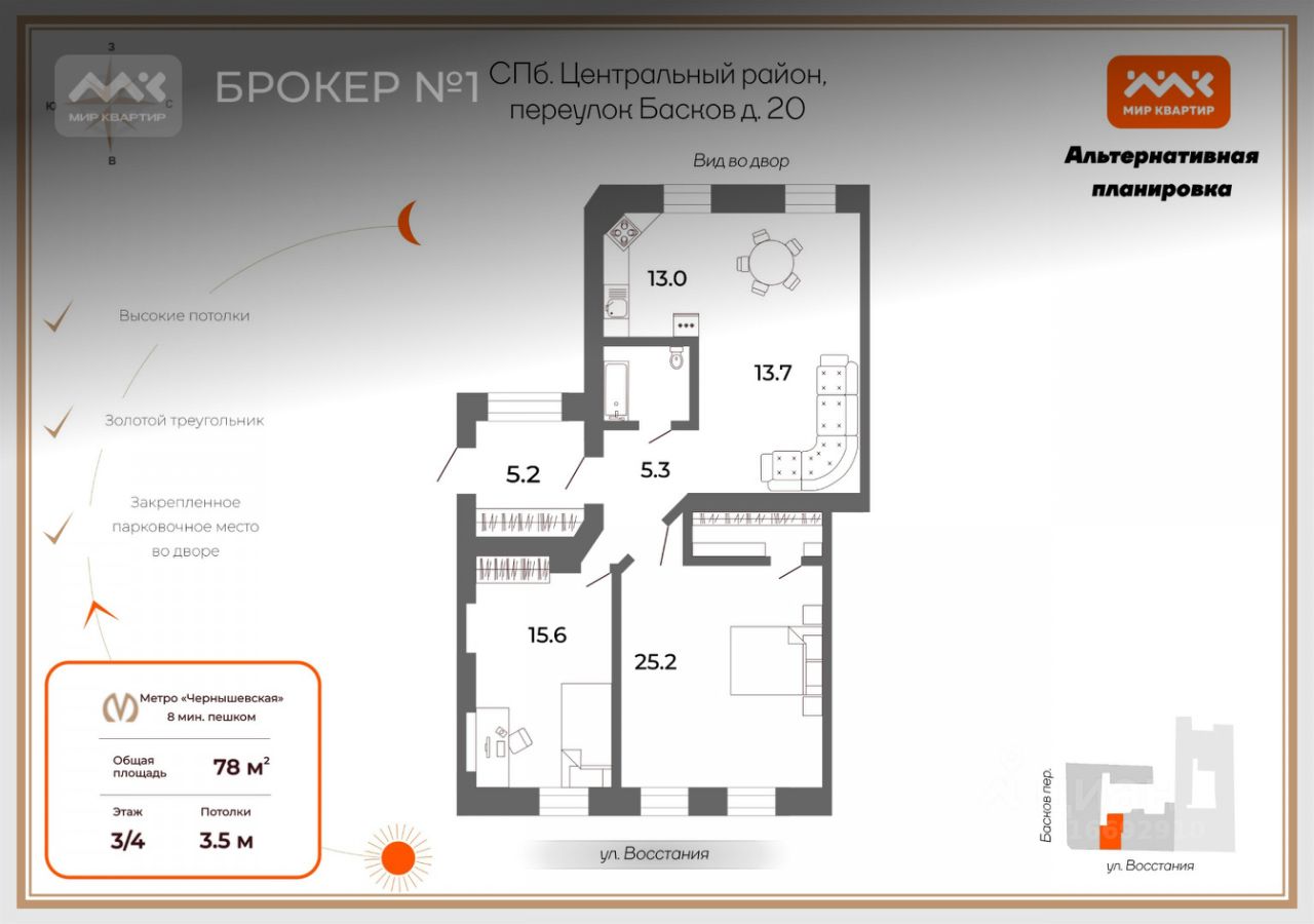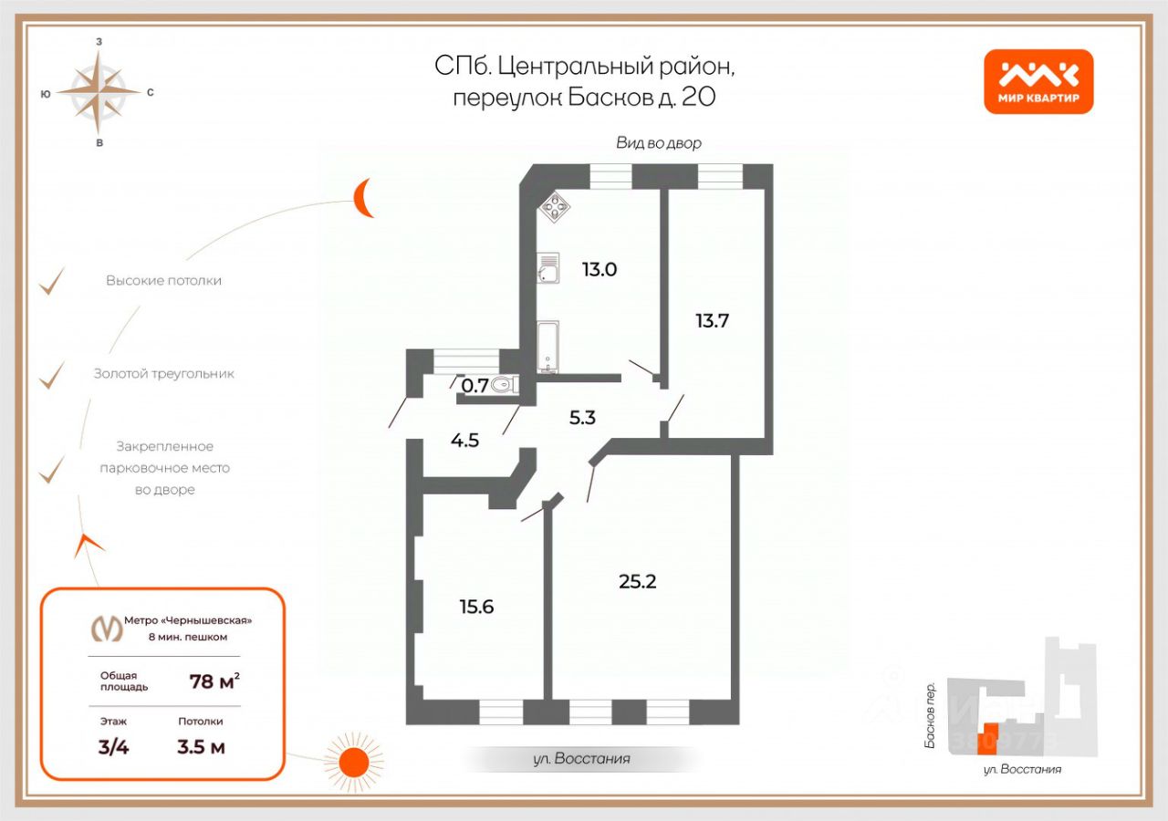 Арт. 101423548 Представляем вашему вниманию квартиру в топовой локации Санкт-Петербурга. На углу ул. Восстания и Баскова переулка расположилась уютная 3-х комнатная квартира. Дом находится в окружении доминант города на Неве Невский проспект, по которому можно прогуляться и посетить многочисленные музеи и выставки, знаменитые кафе и рестораны, Таврический сад, в котором приятно как пробежаться перед началом рабочего дня с утра, так и прогуляться с пернатым другом после его окончания. Дом царской России 1856 года постройки претерпел капитальную реконструкцию в 1957 году, комфортный 3 этаж из 4. Квартира очень светлая, удобной двусторонней планировки с жилыми комнатами 13,7 кв.м., 25,2кв.м., 15.6 кв.м. в которых можно по своему усмотрению и на свой вкус расположить спальню, детскую или кабинет, сделав уютную кухню-столовую, а высокие потолки 3,5м придают пространству ощущение еще большего воздуха и простора. Состояние квартиры требует ремонта, а значит у Вас будет уникальная возможность адаптировать её под свои цели, а также реализовать свои дизайнерские решения. Квартира прекрасно подойдет как для жизни молодой семьи, желающей быть в центре светской жизни города, так и под сдачу в аренду посуточную или долгосрочную - квартиры в этой локации пользуются огромным спросом у гостей города. Звоните сегодня, чтобы завтра эта квартира стала вашей! Предлагаем ПРЕМИАЛЬНОЕ обслуживание для требовательных клиентов. Оперативно организуем просмотр, предоставим полную информацию по объекту.
