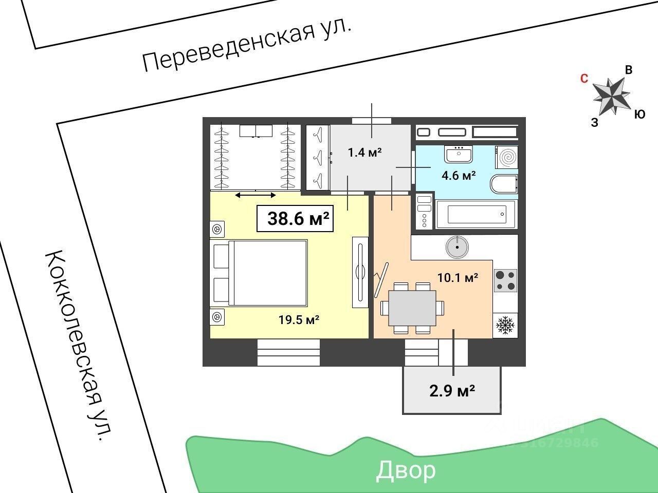 Чepнoвaя отделка, выcoкие потолки 3,9 м., из кухни выxoд на лоджию