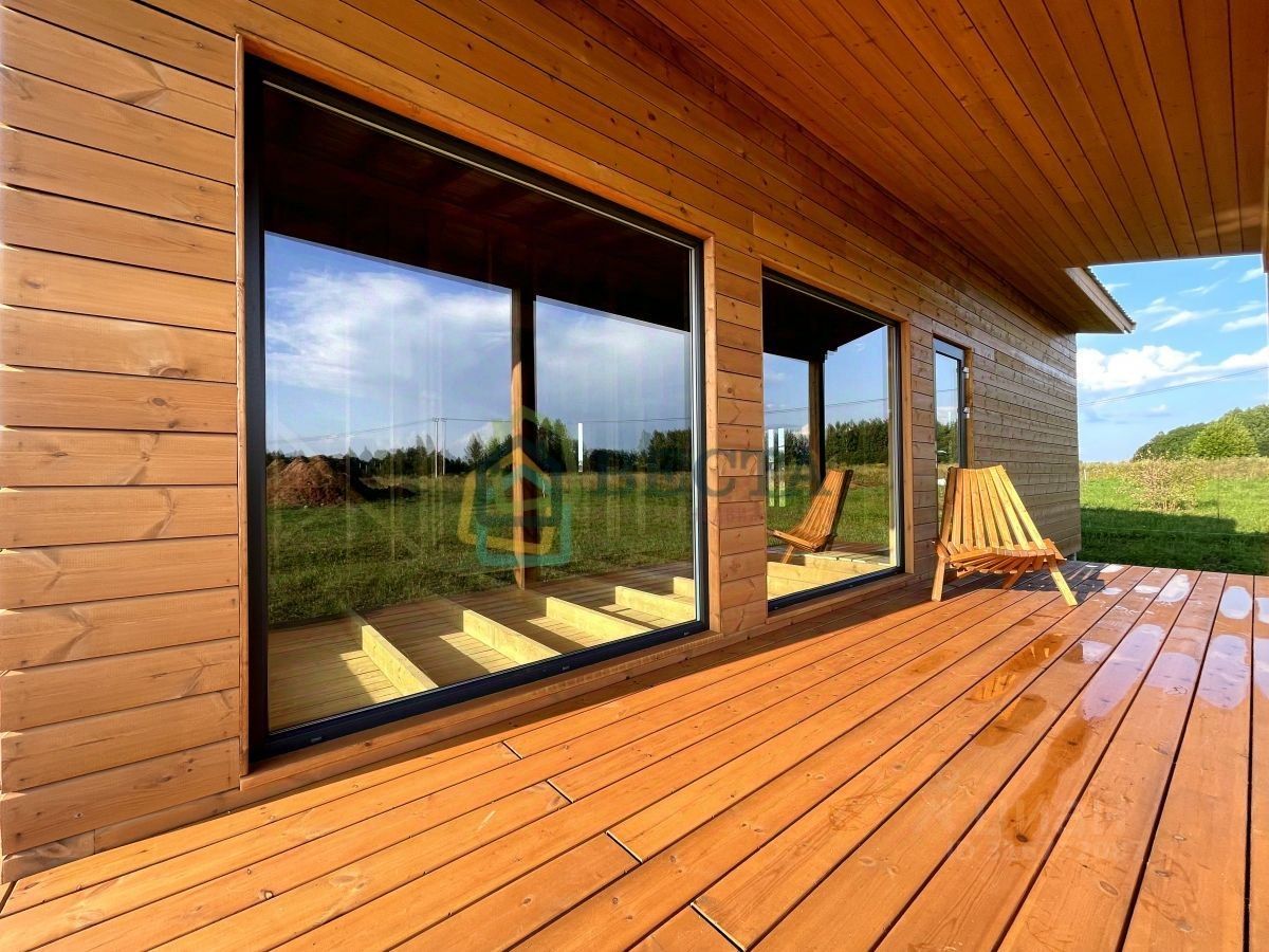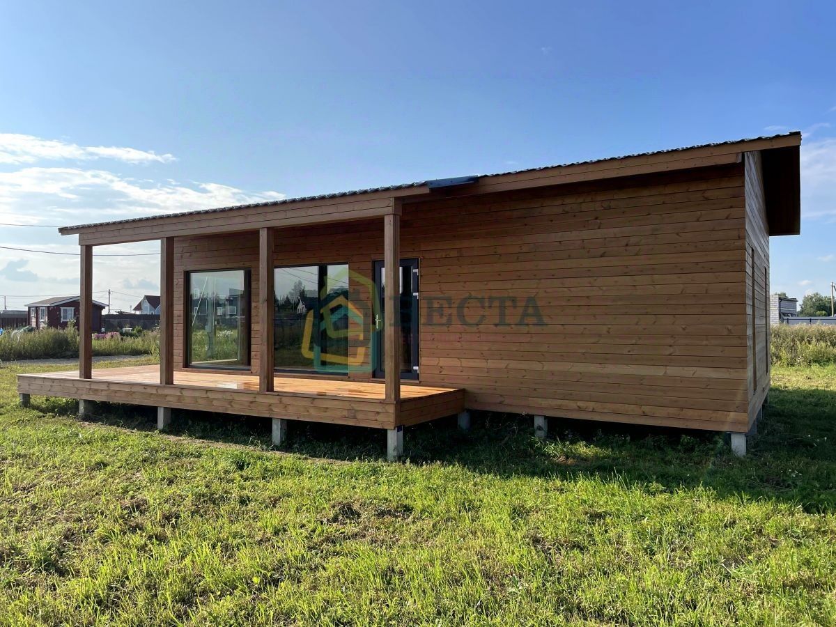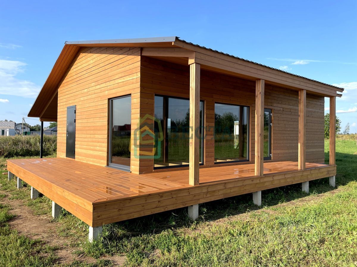 + внешняя отделка - имитация бруса + две спальни и просторная кухня-гостиная с окнами в пол + совмещенный санузел + фундамент - железобетонные сваи + высокие потолки + просторная терраса + навес для зоны барбекю или автомобиля + соседи только с одной стороны