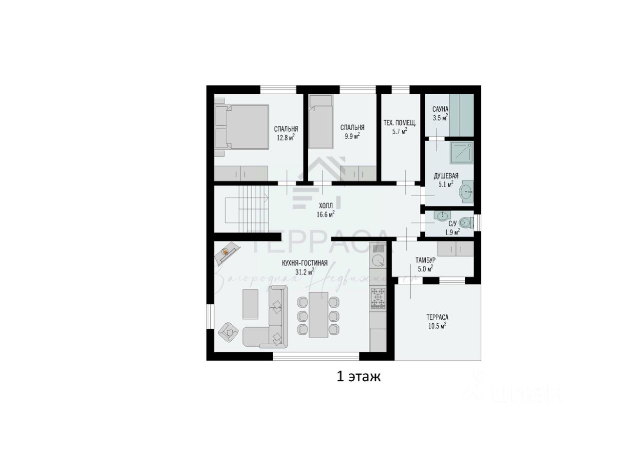 Планировка: 1 этаж - крытая терраса с возможностью расположить уличную мебель, кухня-гостиная, 2 изолированные комнаты, холл, прихожая, сауна с душевой, с/у. 2 этаж - 2 изолированные комнаты, холл с просторным шкафом для одежды, с/у.