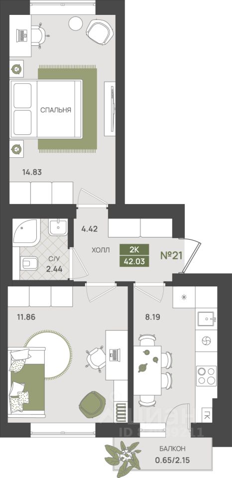 Общая площадь42,03 м2