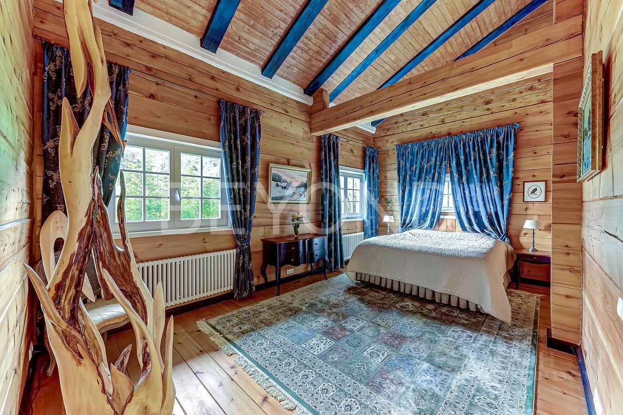 Предлагается к продаже жилой ансамбль для круглогодичного проживания. Роскошный двухэтажный дом построен из цельного бруса особо ценной породы Алтайского кедра (400мм / 220мм). Древесина особо ценной породы Алтайского кедра обладает уникальными специфическими свойствами, благотворно и лечебно воздействует на организм человека, являясь самым ценным материалом для домостроения. Не подвержен гниению и старению. Дом, его внутреннее пространство и интерьеры спроектированы и реализованы художником и скульптором с международным признанием. Высокие потолки. На первом этаже - просторная гостиная высотой 6 метров, с примыканием столовой и функциональной оборудованной кухни. Четыре спальни, два санузла, финская сауна, гардеробные. На втором этаже оборудован спортивный зал, детские комнаты.